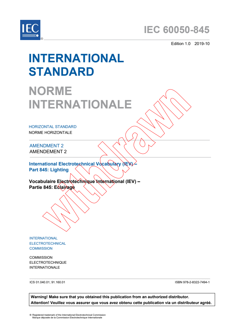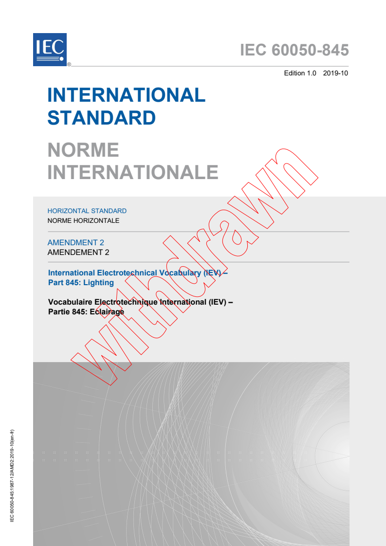 IEC 60050-845:1987/AMD2:2019 - Amendment 2 - International Electrotechnical Vocabulary (IEV) - Part 845: Lighting Released:17. 10. 2019 Isbn:9782832274941