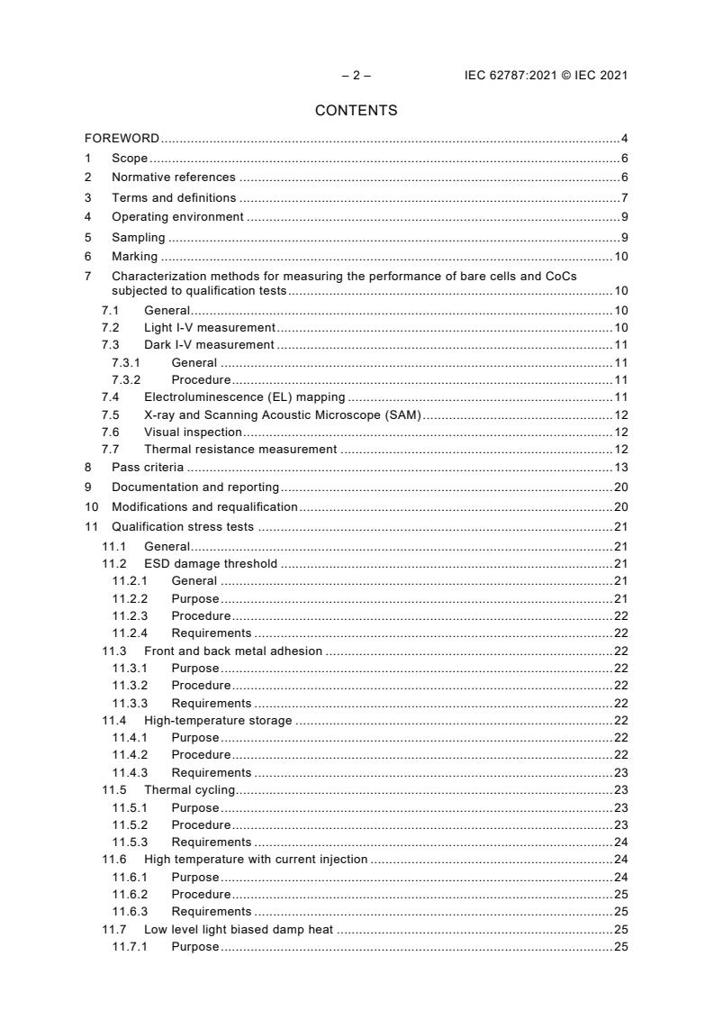 IEC 62787:2021 specifies the minimum requirements for the qualification of concentrator photovoltaic (CPV) cells and Cell on Carrier (CoC) assemblies for incorporation into CPV receivers, modules and systems. The object of this qualification standard is to determine the optoelectronic, mechanical, thermal, and processing characteristics of CPV cells and CoCs to show that they are capable of withstanding assembly processes and CPV application environments. The qualification tests of this document are designed to demonstrate that cells or CoCs are suitable for typical assembly processes, and when properly assembled, are capable of passing IEC 62108.