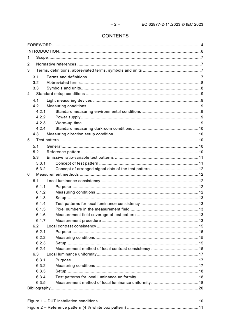IEC 62977-2-11:2023 - Electronic displays: Measurement of optical characteristics - Local luminance and uniformity - defines standardized methods for measuring local luminance and local luminance uniformity of emissive displays. The standard focuses on measurements performed with a light measuring device (LMD) whose measurement field covers more than 500 pixels of TVs, monitors or signage displays. It targets the detection and quantification of optical variations within a specified local block (an area with at least 500 regularly arranged emission pixels), rather than spatially integrated results across the entire panel.