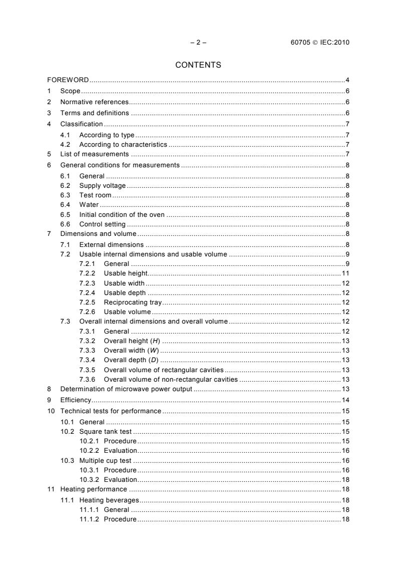 IEC 60705:2010 is a standard published by the International Electrotechnical Commission (IEC). Its full title is "Household microwave ovens - Methods for measuring performance". This standard covers: IEC 60705:2010 applies to microwave ovens for household use. It also applies to combination microwave ovens. This standard defines the main performance characteristics of household microwave ovens which are of interest to the user, and it specifies methods for measuring these characteristics. This fourth edition cancels and replaces the third edition published in 1999, its amendment 1 (2004) and its amendment 2 (2006), and constitutes a technical revision. The main changes from the previous edition are as follows: - the definition of rounding is given in 3.5; - the usable volume and the overall volume are respectively determined in 7.2 and 7.3.