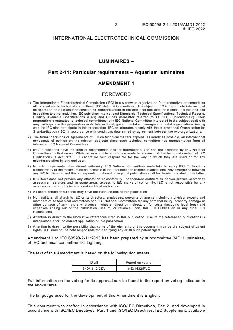 The IEC 60598-2-11:2013/AMD1:2022 is the first amendment to the international standard IEC 60598-2-11:2013, titled "Luminaires – Part 2-11: Particular requirements – Aquarium luminaires." Published by the International Electrotechnical Commission (IEC), this amendment addresses specific safety, construction, and performance requirements for aquarium luminaires. As a key part of international electrotechnical standardization, this document ensures that aquarium lighting products meet consistent safety and quality benchmarks globally.