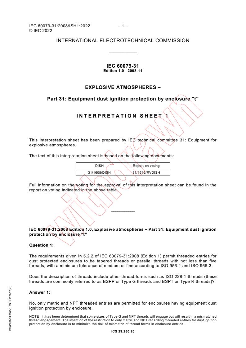 IEC 60079-31:2008 is a standard published by the International Electrotechnical Commission (IEC). Its full title is "Explosive atmospheres - Part 31: Equipment dust ignition protection by enclosure "t"". This standard covers: IEC 60079-31:2008 is applicable to electrical equipment protected by enclosure and surface temperature limitation for use in explosive dust atmospheres. It specifies requirements for design, construction and testing of electrical equipment. This standard supplements and modifies the general requirements of IEC 60079-0. Where a requirement of this standard conflicts with a requirement of IEC 60079-0, the requirement of this standard shall take precedence. This first edition of IEC 60079-31 has been developed from the first edition of IEC 61241-1 (2004) which it now cancels and supersedes. The significant changes with respect to the previous edition are: - Title changed to Equipment dust ignition protection by enclosure "t" - Combination and rationalisation of practice A and B into a single practice, and some constructional requirements that may have applied to only one practice now apply to all enclosures - Introduction of three levels of protection, "ta", "tb" and "tc" - Defined test voltage ranges and overload conditions for thermal tests - Introduction of a pressure test prior to the IP test - Restrictions on power and voltage levels for level of protection "ta" - Introduction of a variant of the IP6X test for level of protection "ta" - Compulsory dust layer thermal test for protection level "ta" by surrounding the enclosure with dust to a depth of at least 500 mm on all available surfaces. The contents of the corrigendum of March 2009 and Interpretation Sheet 1 of February 2022 have been included in this copy.