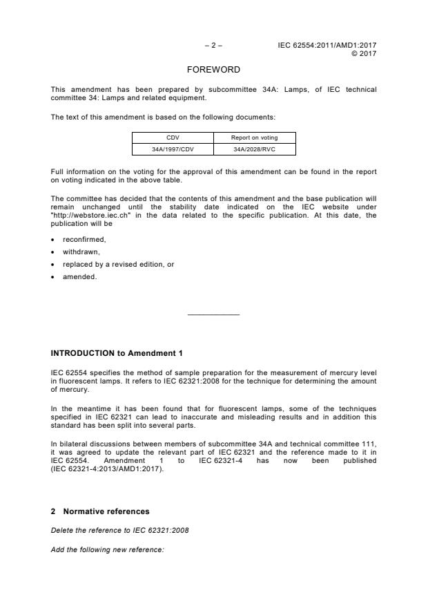 IEC 62554:2011/AMD1:2017 is a standard published by the International Electrotechnical Commission (IEC). Its full title is "Amendment 1 - Sample preparation for measurement of mercury level in fluorescent lamps". This standard covers: Amendment 1 - Sample preparation for measurement of mercury level in fluorescent lamps