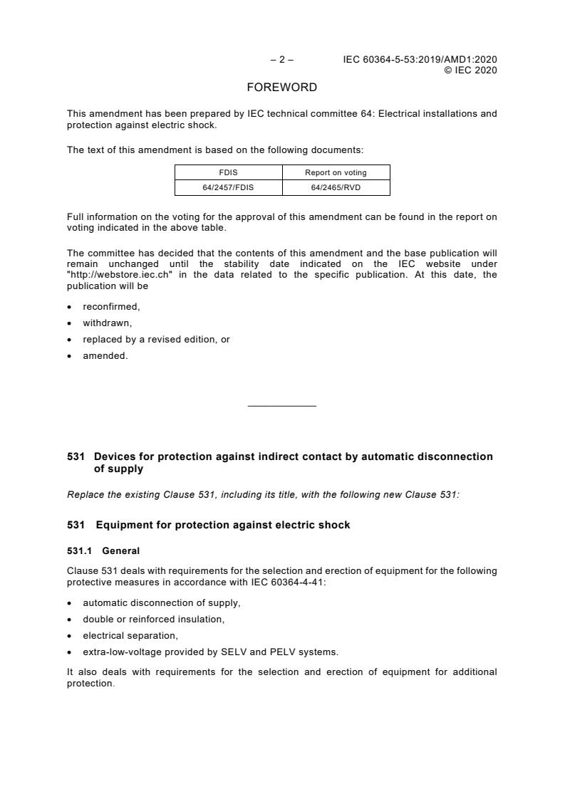 Keywords: IEC 60364-5-53 amendment, low-voltage electrical installations, protective devices, residual current device (RCD), automatic disconnection, electrical safety, isolation equipment, overcurrent protection, electrical standards, electrical earthing systems, TN system, TT system, IT system, electrical protection compliance.