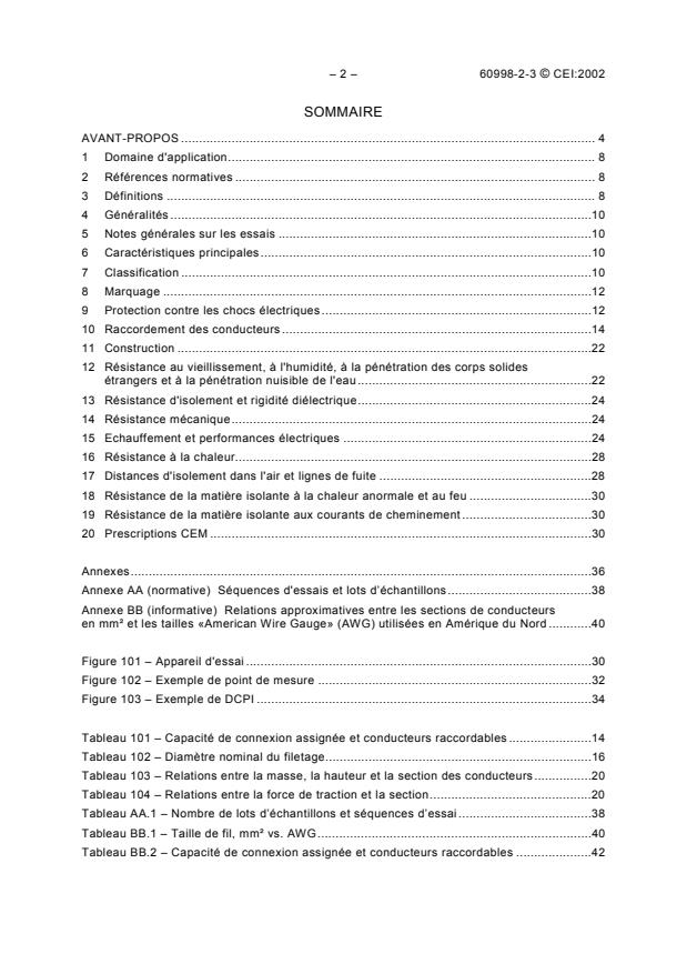IEC 60998-2-3:2002 is an international standard published by the International Electrotechnical Commission (IEC) that specifies particular requirements for connecting devices with insulation-piercing clamping units. These connecting devices are designed for low-voltage circuits primarily used in household and similar applications. The standard addresses devices that connect insulated, unprepared conductors by piercing, removing, or otherwise effectively bypassing the conductor insulation at the points of contact, ensuring secure and reliable electrical connections.
