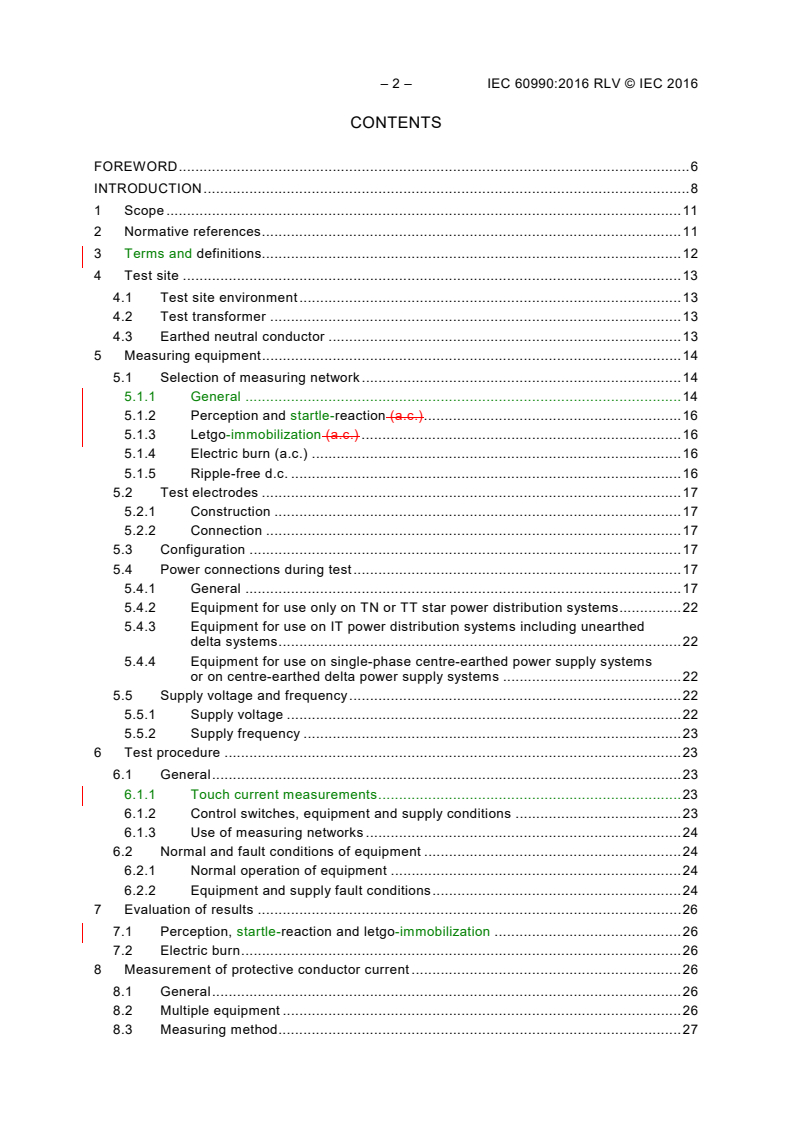 IEC 60990:2016 is a standard published by the International Electrotechnical Commission (IEC). Its full title is "Methods of measurement of touch current and protective conductor current". This standard covers: IEC 60990:2016 defines measurement methods for d.c. or a.c. current of sinusoidal or non-sinusoidal waveform, which could flow through the human body, and current flowing through a protective conductor. The measuring methods recommended for TOUCH CURRENT are based upon the possible effects of current flowing through a human body. In this standard, measurements of current through networks representing the impedance of the human body are referred to as measurements of TOUCH CURRENT. These networks are not necessarily valid for the bodies of animals. The specification or implication of specific limit values is not within the scope of this standard. IEC TS 60479 series provides information regarding the effects of current passing through the human body from which limit values may be derived. This standard is applicable to all classes of EQUIPMENT, according to IEC 61140. The methods of measurement in this standard are not intended to be used for TOUCH CURRENTS having less than 1 s duration, patient currents as defined in IEC 60601-1, a.c. at frequencies below 15 Hz, and currents above those chosen for ELECTRIC BURN limits. This third edition cancels and replaces the second edition published in 1999. It constitutes a technical revision. The principal changes in this edition as compared with the second edition are as follows: - the effects names have been updated to reflect increased understanding of the range of effects and is in concert with present usage; - the conditions of use invoking a GRIPPABLE PART have been reduced in the application of the requirements based upon the current understanding of this effect; - the references to ISO 10012-1, which has been replaced by management standard of the same number, have been replaced with explanatory text, where needed to maintain the sense of the document; - former informative Annex H (GRIPPABLE PART) has been deleted from this update as it does not properly represent the full set of conditions under which immobilization can occur. A new informative Annex H (Analysis of frequency filtered touch current circuits measurement) has been added and the Bibliography (formerly Annex M) has been updated with additional references for completeness. This basic safety publication is primarily intended for use by technical committees in the preparation of standards in accordance with IEC Guide 104 and ISO/IEC Guide 51. It is not intended for use by manufacturers or certification bodies independent of product standards. It has the status of a Basic Safety Publication in accordance with IEC Guide 104. Key words: Touch Current, Protective Conductor Current, Current Flow