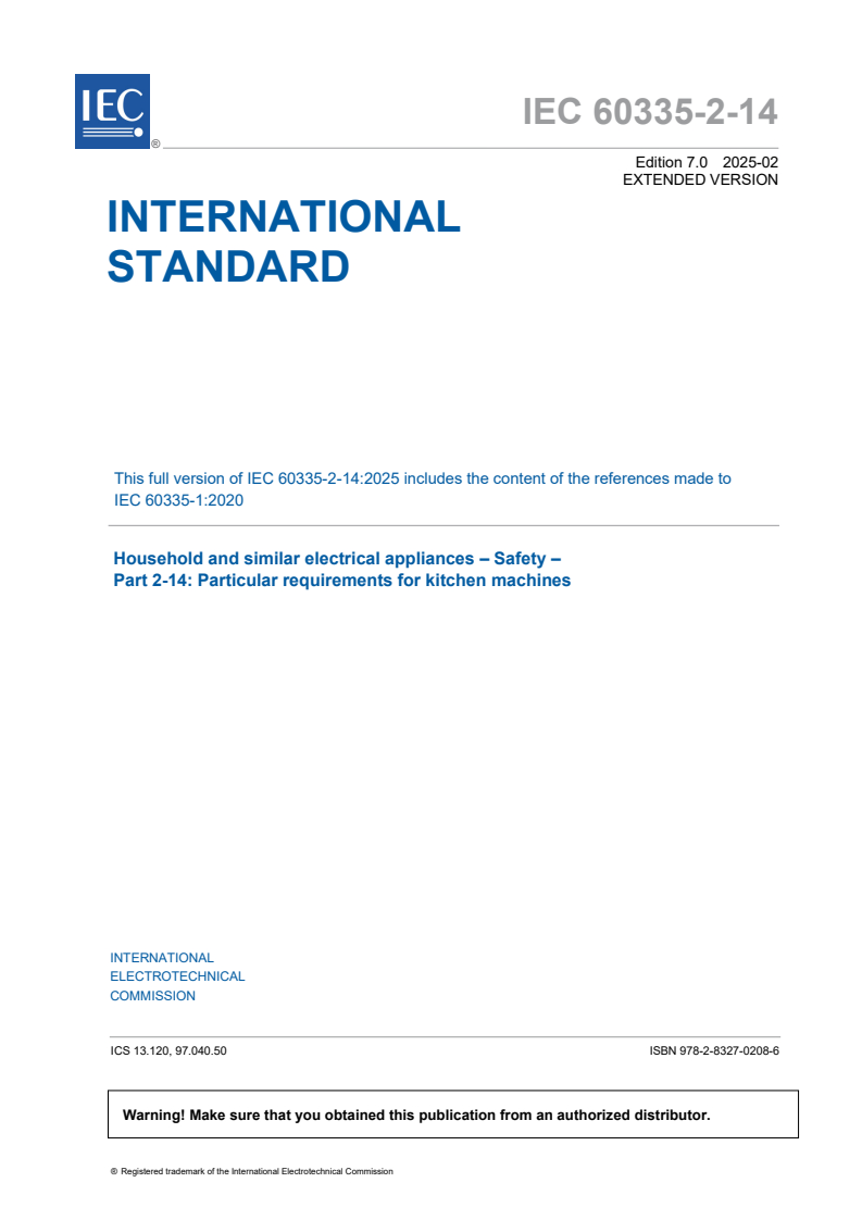 IEC 60335-2-14:2025 deals with the safety of electric kitchen machines for household and similar purposes, their rated voltage being not more than 250 V including direct current (DC) supplied appliances and battery-operated appliances.