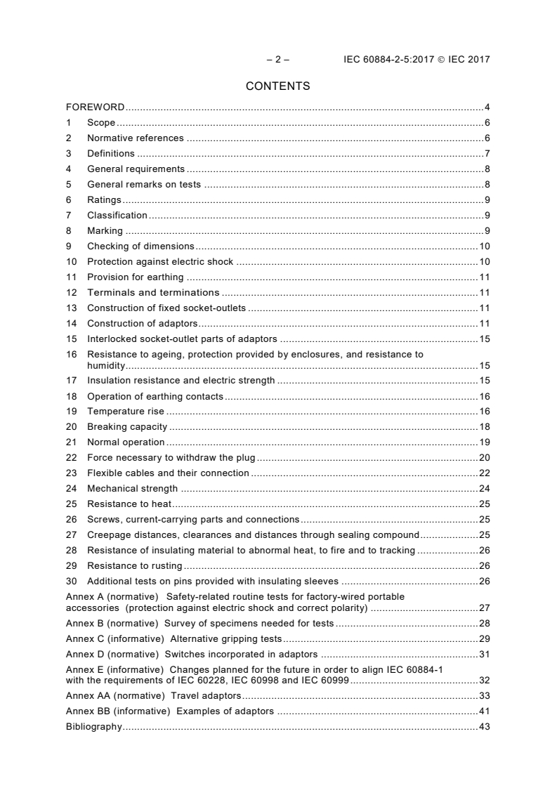 IEC 60884-2-5:2017 applies to adaptors for a.c. only with or without earthing contact, with a rated voltage greater than 50 V but not exceeding 440 V and a rated current not exceeding 32 A, intended for household and similar purposes, either indoors or outdoors. This document also applies to travel adaptors (see Annex AA). For travel adaptors the scope is limited to a voltage rating greater than 50 V but not exceeding 250 V and to a current rating not exceeding 20 A. Travel adaptors allowing the simultaneous connection of two or more plugs are not covered by this document. This second edition cancels and replaces the first edition published in 1995. This edition constitutes a technical revision. This edition includes the following significant technical changes with respect to the previous edition: a) a general alignment with IEC 60884-1:2002, Amendment 1:2006 and Amendment 2:2013; b) new and modified definitions; c) requirements for travel adaptors, for adaptors with additional functions and for adaptors with a cable outlet; d) requirements for adaptors with incorporated overcurrent protective devices; e) requirement to warn against inserting an adaptor into another adaptor; f) new requirements for the construction and shape of the adaptors.