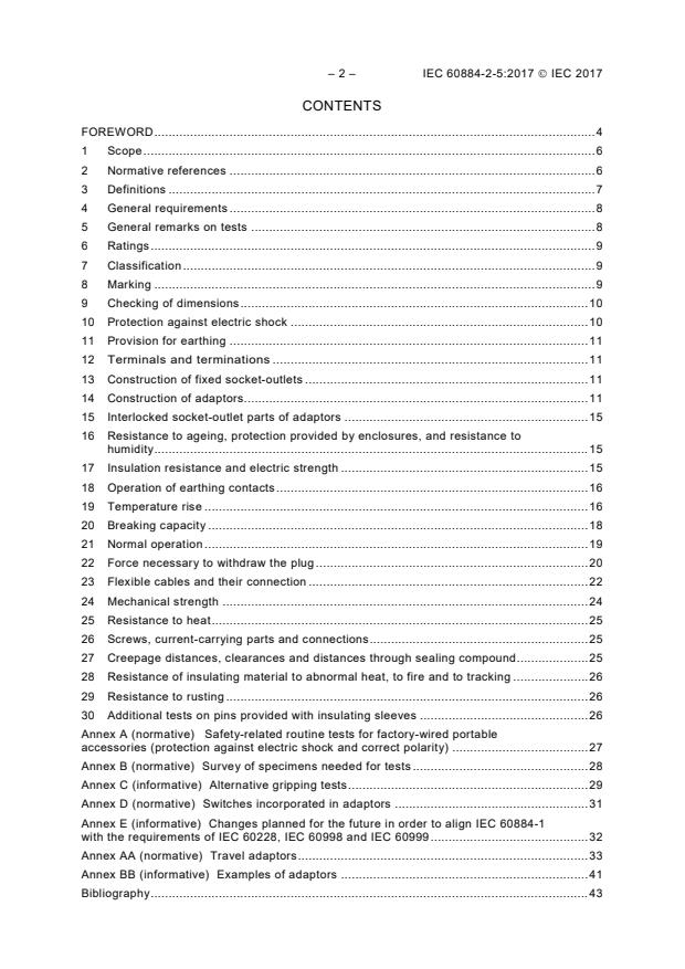 IEC 60884-2-5:2017 is a standard published by the International Electrotechnical Commission (IEC). Its full title is "Plugs and socket-outlets for household and similar purposes - Part 2-5: Particular requirements for adaptors". This standard covers: IEC 60884-2-5:2017 applies to adaptors for a.c. only with or without earthing contact, with a rated voltage greater than 50 V but not exceeding 440 V and a rated current not exceeding 32 A, intended for household and similar purposes, either indoors or outdoors. This document also applies to travel adaptors (see Annex AA). For travel adaptors the scope is limited to a voltage rating greater than 50 V but not exceeding 250 V and to a current rating not exceeding 20 A. Travel adaptors allowing the simultaneous connection of two or more plugs are not covered by this document. This second edition cancels and replaces the first edition published in 1995. This edition constitutes a technical revision. This edition includes the following significant technical changes with respect to the previous edition: a) a general alignment with IEC 60884-1:2002, Amendment 1:2006 and Amendment 2:2013; b) new and modified definitions; c) requirements for travel adaptors, for adaptors with additional functions and for adaptors with a cable outlet; d) requirements for adaptors with incorporated overcurrent protective devices; e) requirement to warn against inserting an adaptor into another adaptor; f) new requirements for the construction and shape of the adaptors.