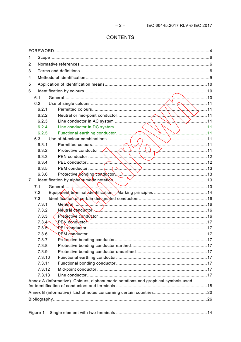 - Edition changes: sixth edition adds colour codes for DC line conductors, a colour code for functional earthing conductors, updates Table A.1, converts non‑mandatory notes to normative text, and aligns terminology with IEC 60050‑195.