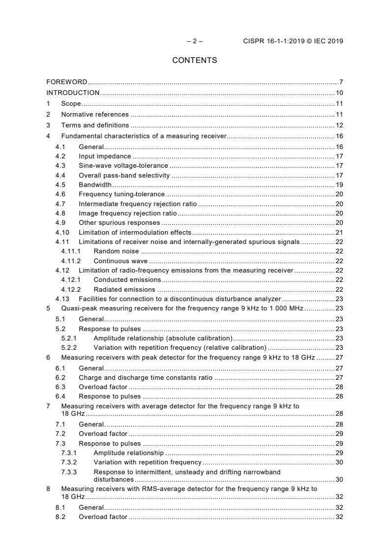 CISPR 16-1-1: 2019 specifies the characteristics and performance of equipment for the measurement of radio disturbance in the frequency range 9 kHz to 18 GHz. In addition, requirements are provided for specialized equipment for discontinuous disturbance measurements. NOTE In accordance with IEC Guide 107, CISPR 16-1-1 is a basic electromagnetic compatibility (EMC) standard for use by product committees of the IEC. As stated in Guide 107, product committees are responsible for determining the applicability of a basic EMC standard. CISPR and its subcommittee are prepared to co-operate with product committees in the evaluation of the value of particular EMC tests for specific products. The specifications in this document apply to electromagnetic interference (EMI) receivers and spectrum analyzers. The term “measuring receiver” used in this document refers to both EMI receivers and spectrum analyzers (see also 3.7). The calibration requirements for measuring receivers are detailed in Annex J. Further guidance on the use of spectrum analyzers can be found in Annex B of any one of the following documents: CISPR 16-2-1:2014, CISPR 16-2-2:2010, or CISPR 16-2-3: 2016.This fifth edition cancels and replaces the fourth edition published in 2015. This edition constitutes a technical revision. Refer to the Foreword of the document for a complete listing of the technical changes from the previous edition.