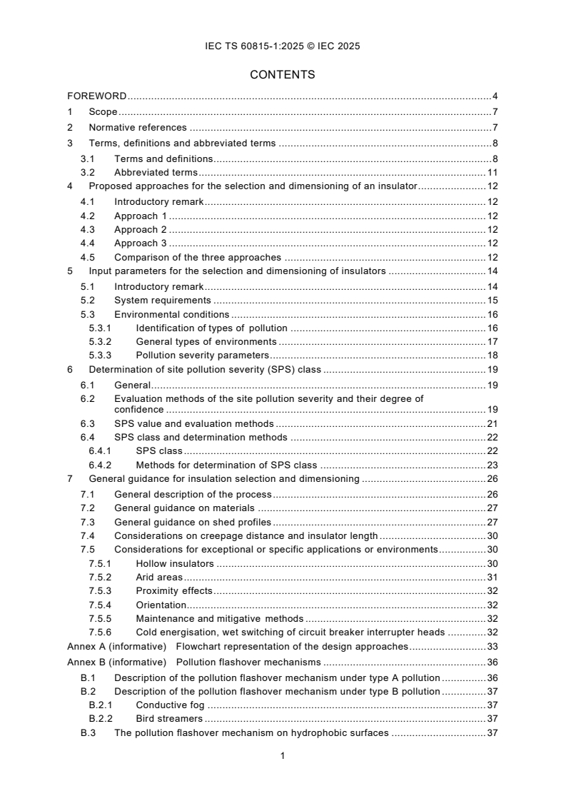 IEC TS 60815-1:2025 is a technical specification published by the International Electrotechnical Commission (IEC). Its full title is "Selection and dimensioning of high-voltage insulators intended for use in polluted conditions - Part 1: Definitions, information and general principles". This standard covers: IEC TS 60815-1:2025 is applicable to the selection of insulators, and the determination of their relevant dimensions, to be used in outdoor high-voltage systems with respect to pollution. For the purposes of this technical specification series, the insulators are divided into the following broad categories, each dealt with in a specific part as follows: - IEC TS 60815-2 – Ceramic and glass insulators for AC systems; - IEC TS 60815-3 – Polymer insulators for AC systems; - IEC TS 60815-4 – Insulators for DC systems. This document provides general definitions, gives methods for the evaluation of site pollution severity (SPS) and outlines the principles to arrive at an informed judgement on the probable behaviour of a given insulator in certain pollution environments. The general principles described are applicable to both AC and DC systems. However, the applicability part mainly refers to AC. More information about DC can be found in IEC TS 60815-4. This document is applicable to all types of external insulation, including insulation forming part of other apparatus. The term "insulator" is used hereafter to refer to any type of insulator. The objective of this technical specification series is to: - understand and identify parameters of the system, application, equipment and site influencing the pollution behaviour of insulators, - understand and choose the appropriate approach to the design and selection of the insulator solution, based on available data, time and resources. - characterise the type of pollution at a site and determine the site pollution severity (SPS) value and the SPS class, - determine the reference unified specific creepage distance (RUSCD) of "reference" insulator based on the SPS class, - select candidate insulators and determine corrections to apply to RUSCD to arrive at the USCD of the "candidate" insulators by taking into account their specific properties (notably their shed profiles), conditions of the site, the application and the type of system, - evaluate the relative advantages and disadvantages of the possible solutions, using HTM or non-HTM insulators, - assess the need and merits of "hybrid" solutions or mitigative measures. The IEC 60815 series does not deal with the effects of ice and snow on polluted insulators. CIGRE documents form a useful complement to this technical specification for those wishing to study in greater depth the performance of insulators under pollution. This second edition cancels and replaces the first edition of IEC TS 60815‑1 published in 2008. This edition constitutes a technical revision. This edition includes the following significant technical changes with respect to the previous edition: a) In the Scope, it is clarified that this specification is applicable to AC and DC conditions while it mainly refers to AC conditions. Detailed application indications refer to AC only. The RUSCD is determined based on the SPS class of reference insulators, and this document does not deal with the effects of ice and snow on polluted insulators; b) Some terms and definitions are modified or introduced in this document, such as RUSCD, creepage factor, average diameter, SPS value and SPS class, hydrophobicity transfer and HTM, etc.; c) Clause 5 is re-organized and revised regarding input parameters for the selection and dimensioning of insulators, including system requirements and environmental conditions; d) Clause 6 "Determination of site pollution severity (SPS) class" is re-organized and re-written. A distinction was made between SPS value and SPS class. The measurement of pollution that is made on the de-energized reference insulator is valid for AC only; e) A new pollution class, extremely heavy class f, is added. It is applicable only to the special situations of extremely heavy pollution when the RUSCD of class e cannot meet the requirements. The RUSCD value for class f is not specified; f) The parameters of reference insulators were defined; g) The pro