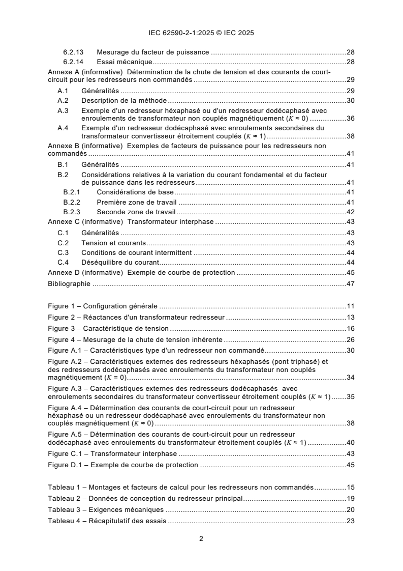 IEC 62590-2-1:2025 This document includes the following significant technical changes with respect to IEC 62589 and the former IEC 62590: a) Reduction of the requirements for uncontrolled rectifiers only; b) Interface model for the different systems connected; c) Energy efficiency addressed. This part of IEC 62590 describes functions and working principles, specifies requirements, interfaces and test methods of uncontrolled rectifiers for DC electric traction power supply systems. Uncontrolled rectifiers connect a 3AC power network with a DC electric traction system with a unidirectional power flow using diode assemblies. The coordination between the transformer and the rectifier diode assembly is included. This document applies to fixed installations of following electric traction power supply systems: • railway networks; • metropolitan transport networks including metros, tramways, trolleybuses and fully automated transport systems, magnetic levitated transport systems, electric road systems. This first edition of IEC 62590-2-1, in conjunction with the other parts of the IEC 62590 series, cancels and replaces the first edition of IEC 62589 published in 2010 and the second edition of IEC 62590 published in 2019.