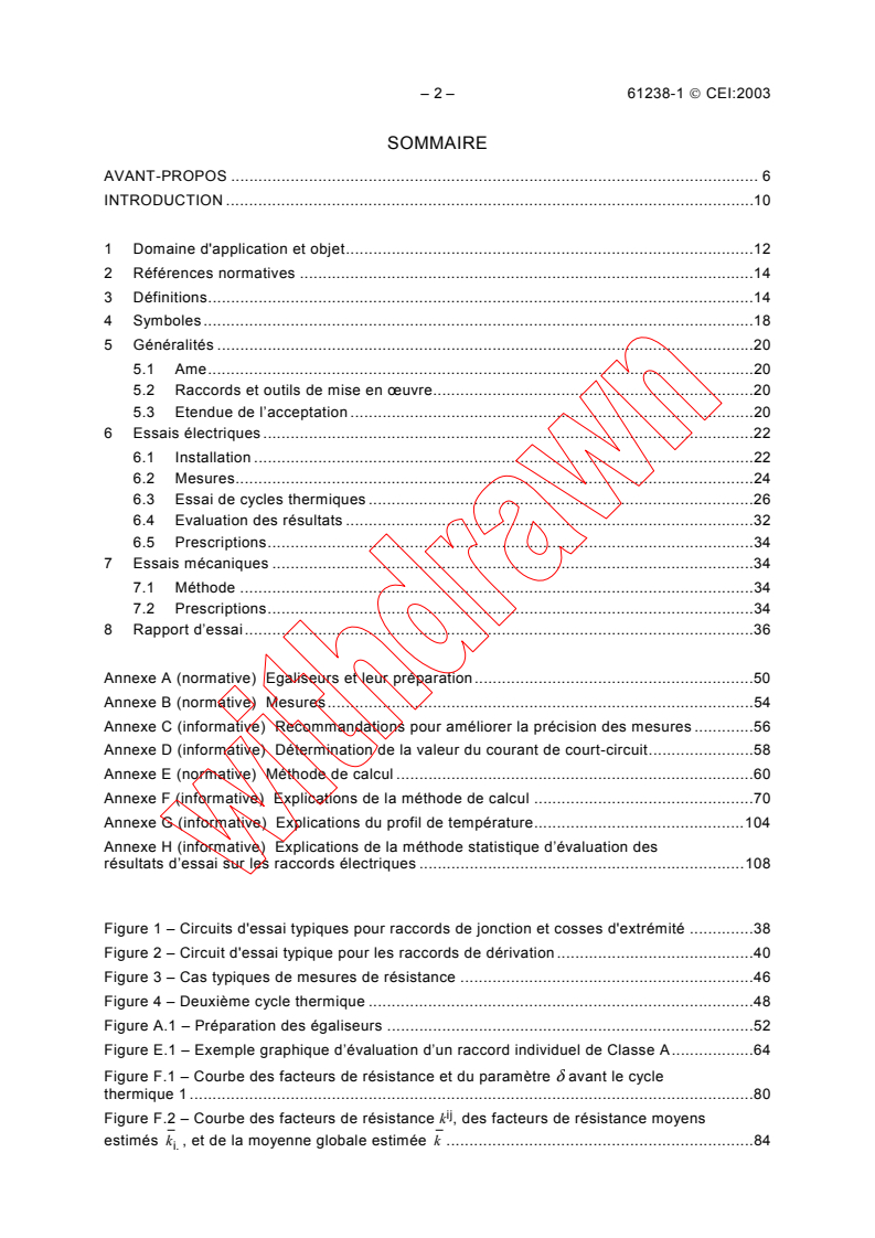 La présente partie de la CEI 61238 est applicable aux raccords sertis et à serrage mécanique pour câbles d'énergie de tensions assignées inférieures ou égales à 30 kV (Um = 36 kV), par exemple pour les câbles enterrés ou ceux installés à l'intérieur des bâtiments, ayant - des âmes conformes aux prescriptions de la CEI 60228 et de la CEI 60228A, de section nominale au moins égale à 10 mm2 pour le cuivre et au moins égale à 16 mm2 pour l'aluminium, - une température maximale de fonctionnement en service permanent au plus égale à 90 °C. La présente norme n'est pas applicable aux raccords pour conducteurs aériens, qui sont conçus pour des prescriptions mécaniques spécifiques, ni aux raccords des connecteurs séparables équipés d'un contact glissant, ni aux raccords multipolaires (c'est-à-dire les connecteurs à arceau). Bien qu'il ne soit pas possible de définir avec précision les conditions d'utilisation pour toutes les applications, deux grandes classes de raccords ont été définies. Classe A Il s'agit des raccords destinés à la distribution d'électricité ou aux réseaux industriels, dans lesquels ils peuvent être soumis à des courts-circuits d'intensité et de durée relativement élevées. En conséquence, les raccords de Classe A sont adaptés à la majorité des applications. Classe B Il s'agit des raccords destinés aux réseaux dans lesquels les surcharges ou les courts-circuits sont rapidement éliminés par des dispositifs de protection installés, par exemple des fusibles à coupure rapide. Selon leur application, les raccords sont soumis aux essais suivants: Classe A: cycles thermiques et essais de court-circuits; Classe B: cycles thermiques uniquement. L'objet de la présente norme est de définir les méthodes d'essais de type et les prescriptions à appliquer aux raccords sertis et à serrage mécanique utilisables sur les câbles d'énergie à conducteurs en cuivre ou en aluminium. Antérieurement, les acceptations des produits ont été prononcées sur la base de normes et spécifications nationales et/ou la démonstration d'un comportement satisfaisant en service. La publication de la présente norme CEI ne rend pas caduques les acceptations existantes. Toutefois, les produits acceptés selon les normes ou spécifications antérieures ne peuvent se prévaloir d'une acceptation selon la présente norme CEI que s'ils ont été essayés spécifi-quement selon les modalités qui y sont indiquées. Une fois ces essais effectués, il n'est pas nécessaire de les répéter, à moins que des modifications n'aient été introduites dans le matériau du raccord, dans sa conception ou dans son procédé de fabrication, susceptibles d'en modifier les caractéristiques de fonctionnement. Par rapport à l'édition précédente, les modifications techniques majeures sont les suivantes: - Le domaine d'application est désormais restreint aux raccords destinés aux câbles d'énergie de tension assignée inférieure ou égale à 30 kV (Um = 36 kV); - La notion de mesure directe de résistance a été introduite, en variante de la mesure indirecte, avec des tolérances associées; - Des limites de température ont été indiquées pour les raccords à perforation d'isolant, en fonction de la nature de l'enveloppe isolante; - Pour les essais de court-circuit, des tolérances sur la durée ont été indiquées et des recommandations ont été introduites pour les fortes sections; - Certains critères d'acceptation ont été révisés et harmonisés entre les raccords à serrage mécanique et les raccords sertis; - L'information devant figurer dans le rapport d'essai a été ajoutée; - Des annexes informatives ont été introduites, donnant des indications sur la précision des mesures, la méthode de calcul, le profil de température et la méthode d'évaluation statistique.