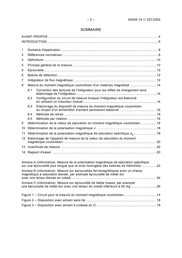 Applicable à tous les matériaux ferromagnétiques. Elle est en particulier dédiée à la mesure du moment magnétique coulombien des matériaux d'aimant permanent (magnétiquement durs) et à la mesure de la polarisation magnétique de saturation spécifique des matériaux consolidés par des carbures ayant un liant ferro-magnétique. Décrire les principes généraux de la détermination du moment magnétique coulombien d'une éprouvette de matériau ferro-magnétique en utilisant une bobine de détection dans un circuit magnétique ouvert. Avec l'adjonction d'un moyen de magnétisation du matériau à saturation, le moment magnétique coulombien de saturation peut également être déterminé. En outre, la polarisation magnétique moyenne d'une éprouvette peut être déduite de la mesure de son moment magnétique coulombien et de son volume. L'étalonnage de systèmes à bobines pour le moment magnétique et la mesure du moment magnétique coulombien de matériaux faiblement magnétiques peuvent également être réalisés en utilisant cette méthode. Les mesures sont normalement exécutées à la température ambiante mais des mesures à d'autres températures peuvent être réalisées en chauffant ou en refroidissant le volume qui est occupé par l'éprouvette dans la bobine de détection. La mesure de la rémanence, de la coercitivité, du produit maximal d'énergie et d'autres para-mètres peut être faite dans un circuit magnétique fermé comme décrit dans la CEI 60404-4 et dans la CEI 60404-5. La mesure de la coercitivité HcJ des matériaux doux et semi-durs peut également être exécutée dans un circuit ouvert comme décrit dans la CEI 60404-7.