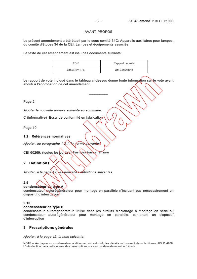 Amendement 2 - Condensateurs destinés à être utilisés dans les circuits de lampes tubulaires à fluorescence et autres lampes à décharge. Prescriptions générales et de sécurité