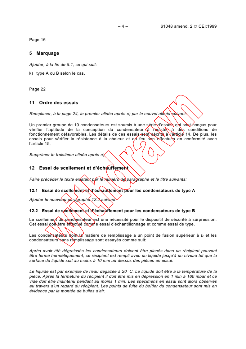 The amendment details comprehensive test sequences which capacitors must pass to demonstrate safety and reliability:- Sealing and Heating Tests for both capacitor types, including immersion in degassed water under vacuum to detect leakage.