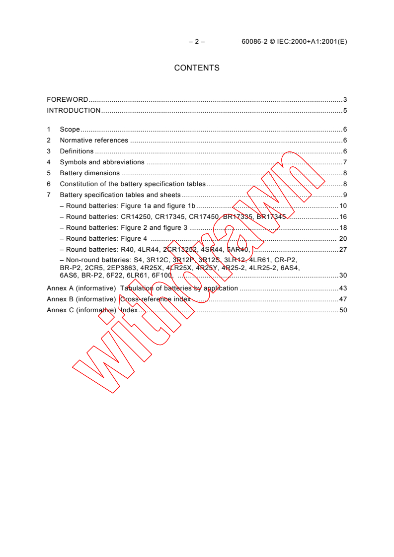 IEC 60086-2:2000 is a standard published by the International Electrotechnical Commission (IEC). Its full title is "Primary batteries - Part 2: Physical and electrical specifications". This standard covers: Applicable to primary batteries based on standardized electrochemical systems, it specifies the physical dimensions, the discharge test conditions, and the discharge performance requirements.