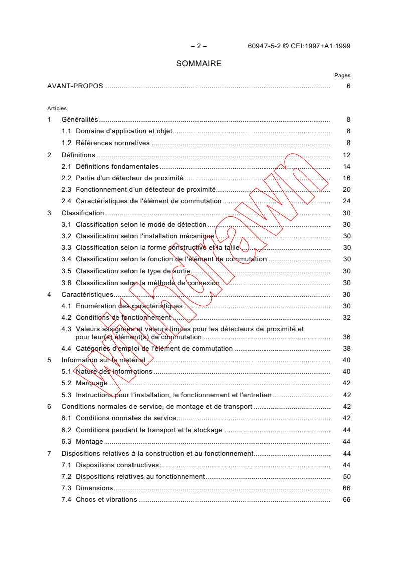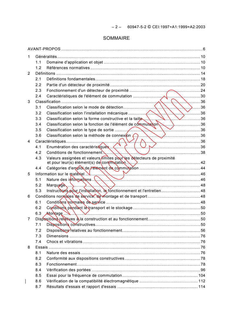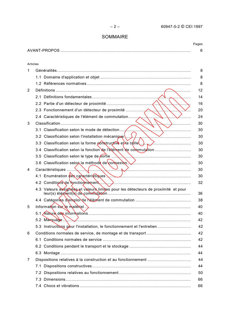 S'applique aux détecteurs de proximité inductifs et capacitifs qui détectent la présence d'objets métalliques et/ou non métalliques, aux détecteurs de proximité ultrasoniques qui détectent la présence d'objets réfléchissantS les ultrasons, aux détecteurs de proximité photoélectriques qui détectent la présence d'objets et aux détecteurs de proximité magnétiques non mécaniques qui détectent la présence d'objets avec un champ magnétique. Ces détecteurs de proximité sont des appareils complets, comprenant des éléments de commutation à semiconducteurs et sont destinés à être connectés à des circuits dont la tension nominale n'excède pas 250 V 50 Hz/60 Hz courant alternatif ou 300 V courant continu. La présente norme n'est pas prévue pour couvrir les détecteurs de proximité analogiques.