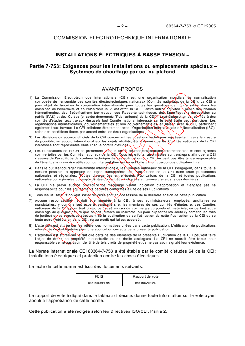 IEC 60364-7-753:2005 is a standard published by the International Electrotechnical Commission (IEC). Its full title is "Low-voltage electrical installations - Part 7-753: Requirements for special installations or locations - Floor and ceiling heating systems". This standard covers: Applies to the installation of electric floor and ceiling heating systems which are erected as either thermal storage heating systems or direct heating systems. It does not apply to the installation of wall heating systems. Heating systems for use outdoors are not considered.