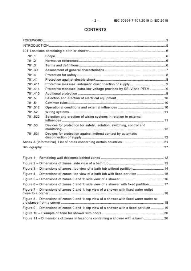 IEC 60364-7-701:2019 is a standard published by the International Electrotechnical Commission (IEC). Its full title is "Low-voltage electrical installations - Part 7-701: Requirements for special installations or locations - Locations containing a bath or shower". This standard covers: IEC 60364-7-701:2019 applies to electrical installations in indoor or outdoor locations where a bath tub and/or a shower is intended to be permanently placed in a specific location. The extent of the location containing a bath tub and/or a shower is limited by: – the lowest finished floor level; – a horizontal plane 3 m above the lowest finished floor level; – a vertical circumscribing virtual surface at a distance of 4 m from the fixed water outlet for the bath tub or shower; and – the volume within the walls, floor and ceiling that border the location containing a bath or shower, measured to a depth of 6 cm. The requirements of this document also apply to fixed electrical installations in mobile applications, for example caravans, mobile homes, shower containers. This document does not apply to emergency facilities, for example emergency showers used in industrial areas or laboratories. This third edition cancels and replaces the second edition published in 2006. This edition constitutes a technical revision. This edition includes the following significant technical changes with respect to the previous edition: – the scope gives precisions relevant to the application of this document; – the description of zones is improved; – relevant terms are defined.
