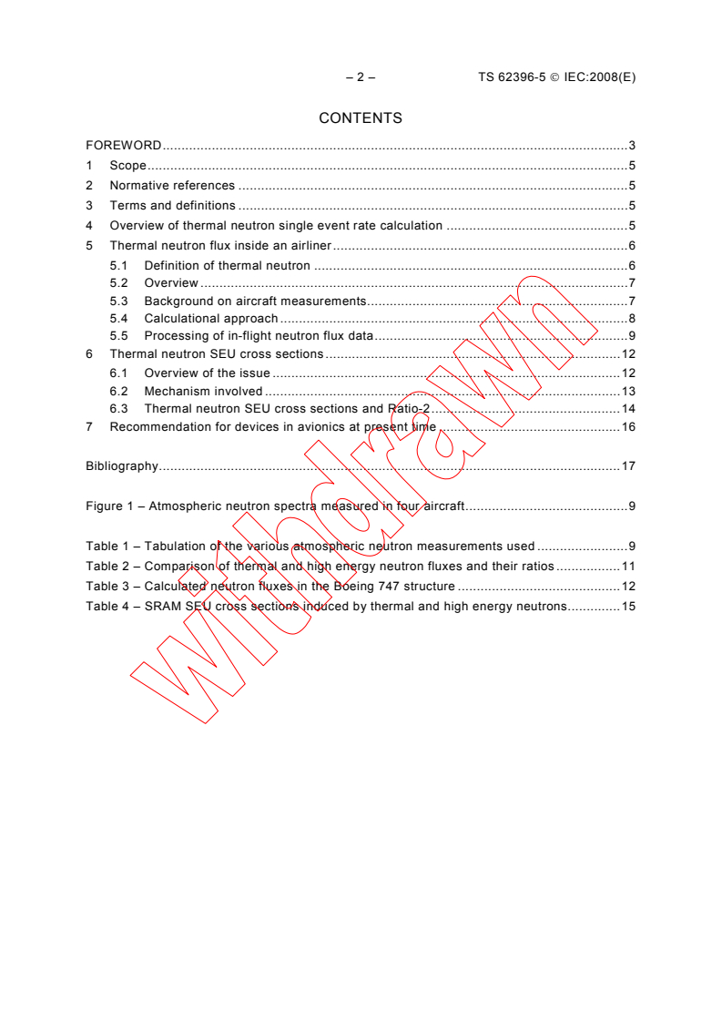 IEC TS 62396-5:2008 (E) provides a more precise definition of the threat that thermal neutrons pose to avionics as a second mechanism for inducing single event upset (SEU) in microelectronics. Addresses more in detail the following: detailed evaluation of the existing literature on measurements of the thermal flux inside of airliners; an enhanced compilation of the thermal neutron SEU cross section in currently available SRAM devices (more than 20 different devices).