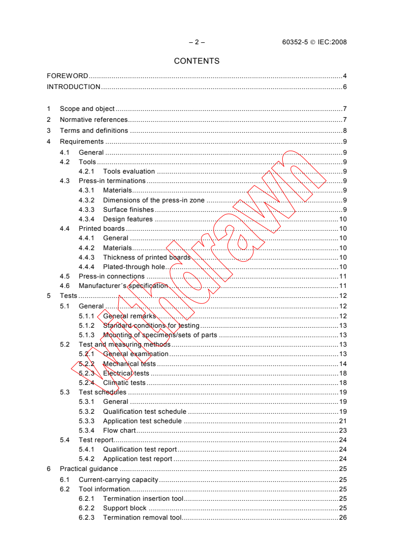 IEC 60352-5:2008 is an international standard developed by the International Electrotechnical Commission (IEC) that establishes the general requirements, test methods, and practical guidance for solderless press-in connections. This standard applies primarily to solderless press-in connections used in telecommunication equipment and similar electronic devices. It focuses on ensuring the suitability and reliability of press-in connections under various mechanical, electrical, and environmental conditions. The 2008 edition includes significant updates such as recommendations for using four-layer test boards, revised tolerance range requirements, and allowance for alternative plating materials beyond tin or tin/lead.