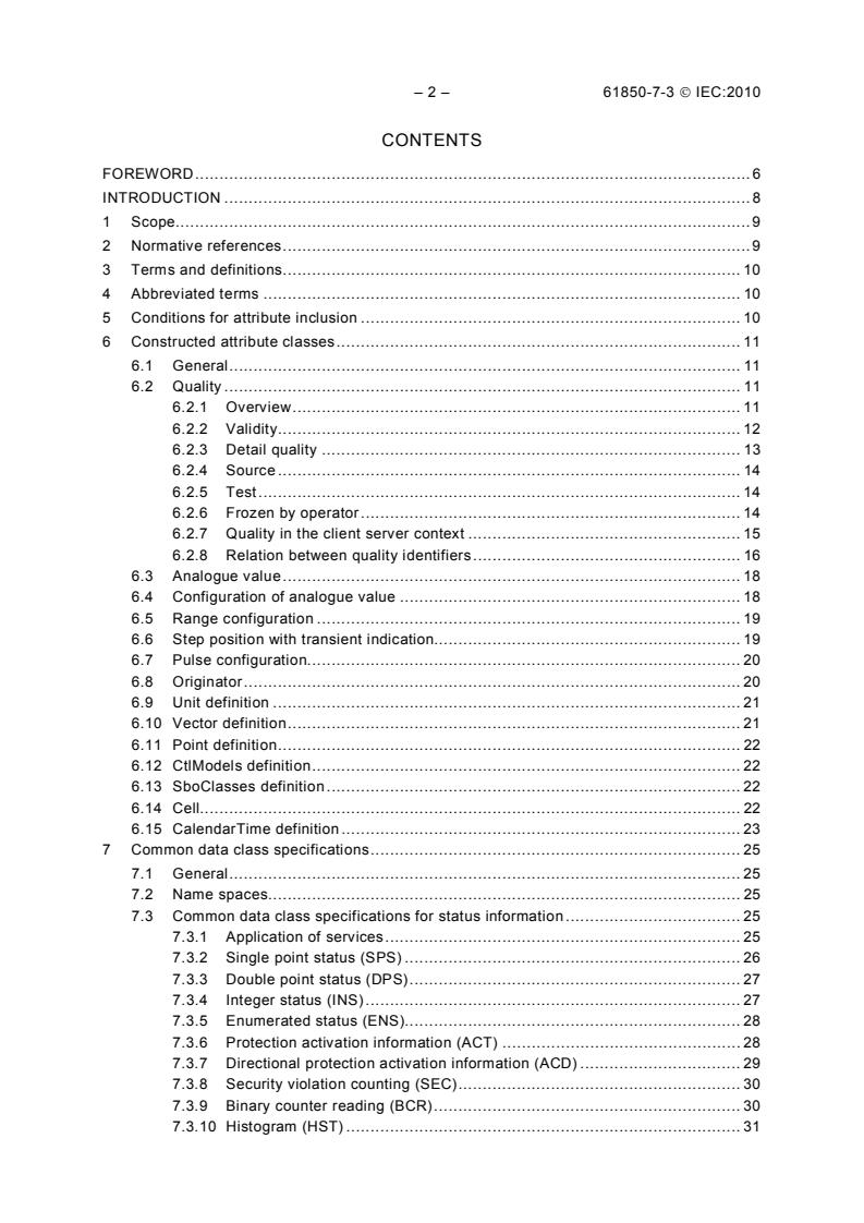 IEC 61850-7-3:2010 is a standard published by the International Electrotechnical Commission (IEC). Its full title is "Communication networks and systems for power utility automation - Part 7-3: Basic communication structure - Common data classes". This standard covers: IEC 61850-7-3:2010 is applicable to the description of device models and functions of substations and feeder equipment. It specifies constructed attribute classes and common data classes related to substation applications. In particular, it specifies common data classes for status information, common data classes for measured information, common data classes for control, common data classes for status settings, common data classes for analogue settings and attribute types used in these common data classes. This second edition defines new common data classes used for new standards defining object models for other domains based on IEC 61850 and for the representation of statistical and historical data. This publication is of core relevance for Smart Grid.