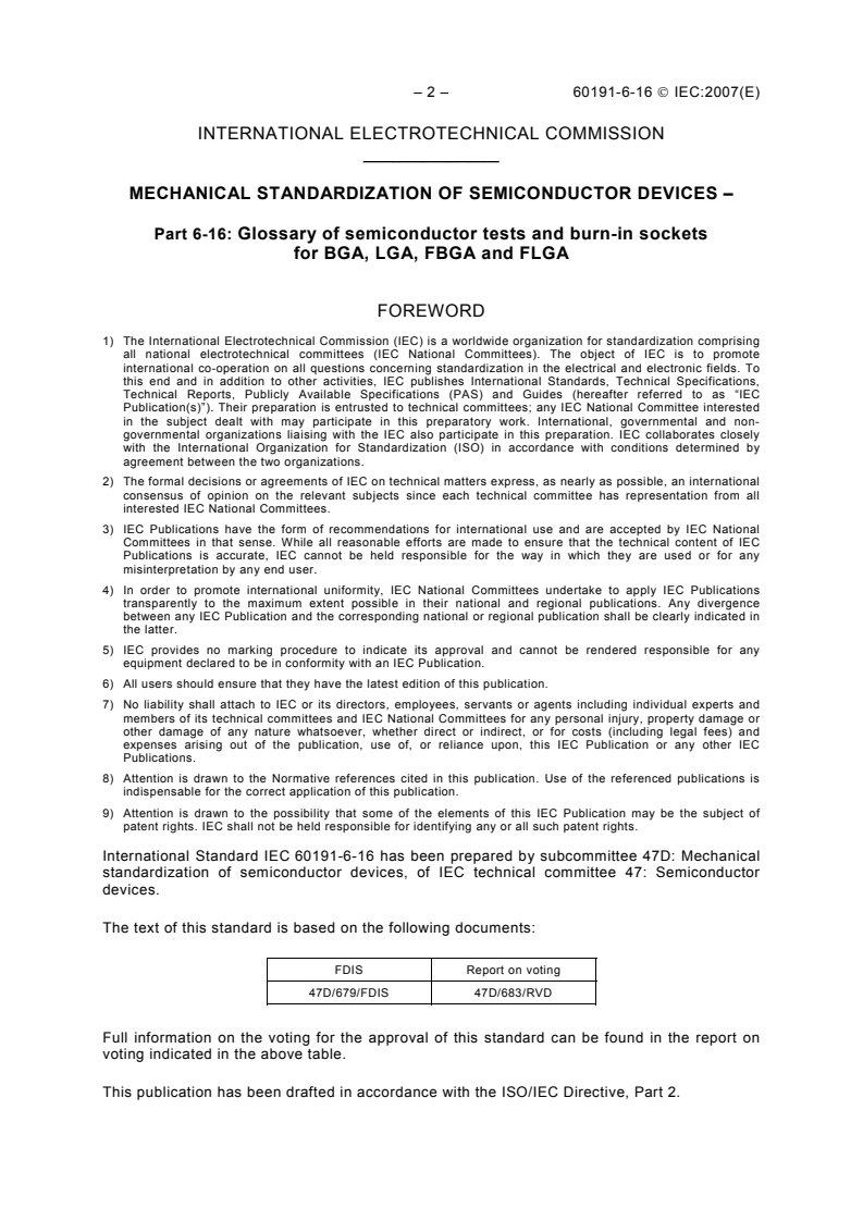 IEC 60191-6-16:2007 is an international standard developed by the International Electrotechnical Commission (IEC) that focuses on the mechanical standardization of semiconductor devices. Specifically, this part-Part 6-16-provides a detailed glossary of terms related to semiconductor tests and burn-in sockets designed for Ball Grid Array (BGA), Land Grid Array (LGA), Fine-pitch Ball Grid Array (FBGA), and Fine-pitch Land Grid Array (FLGA) packages.