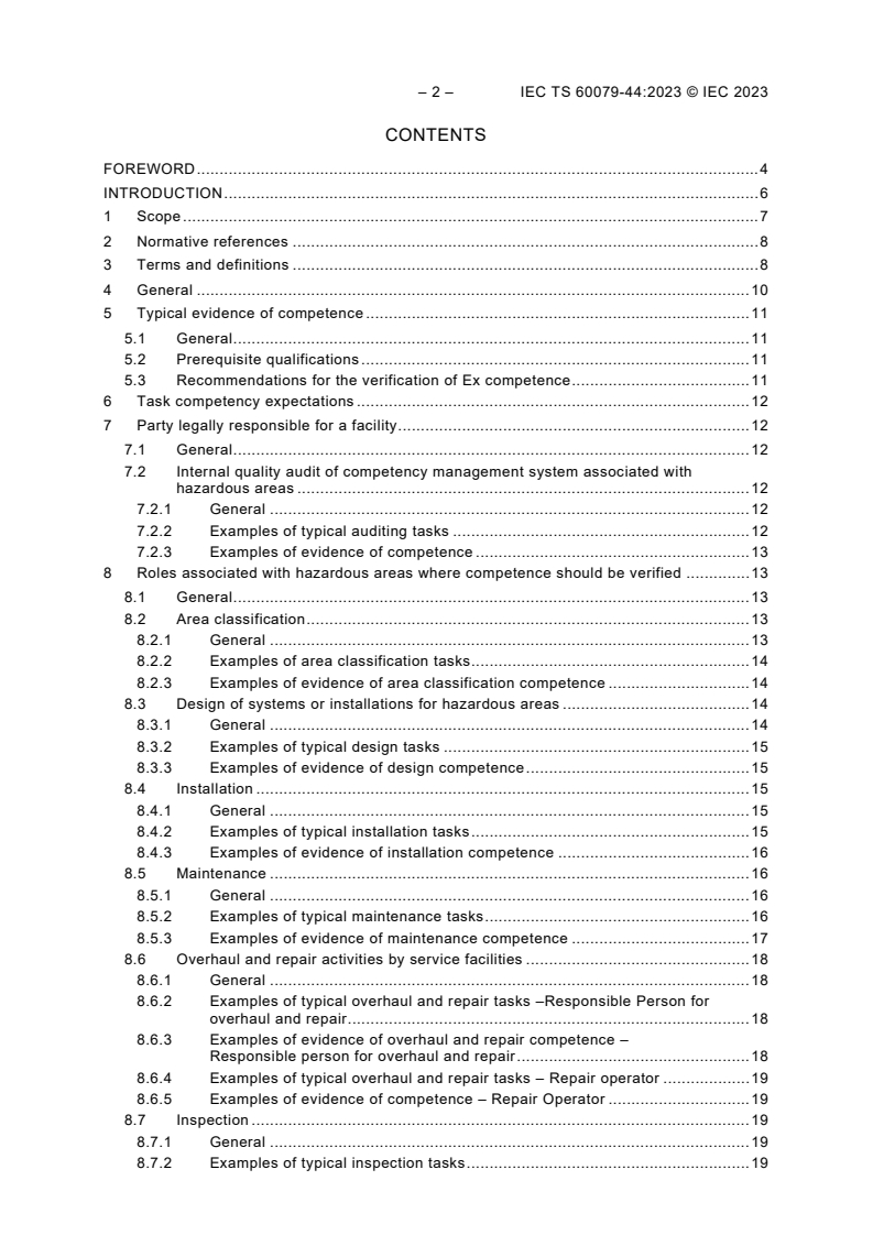 IEC TS 60079-44:2023, which is a Technical Specification, is to provide guidance to establish recommended minimum criteria to determine roles, establish expectations of the necessary skills and evidence of competence to assess and manage the competence of personnel conducting work in or associated with hazardous areas. The purpose of this document is to provide guidance to establish: • recommended minimum criteria to determine roles, • expectations of the necessary skills, and • evidence of competence in order to assess and manage the competence of personnel who are conducting work in or associated with hazardous areas. This document provides examples and recommendations of minimum levels of competence for typical roles associated with hazardous areas by addressing the knowledge, skills, or abilities that is expected of personnel. Additionally, examples of the evidence of competence expected for each role are provided. The aim of tThis document is to assist in defining, assessing, and managing unique requirements for the competence of individuals working in or associated with installations where an explosive atmosphere could be present. Such a programme could be specific to a facility or used in conjunction with other regulatory requirements where they exist. The competencies for conducting work in a hazardous area are in addition to any competencies which may apply for the general type of work being undertaken (for example, professional credentials, electrical, non-electrical, operations, design). This document applies to both electrical and non-electrical applications. This document identifies the minimum level of knowledge and skills required to work in hazardous areas and the specific competence required for work associated with equipment for explosive atmospheres (commonly termed ‘Ex Equipment’) and the standards to which competence is to be assessed and attributed. The purpose of this document is to provide guidance to establish: • recommended minimum criteria to determine roles, • expectations of the necessary skills, and • evidence of competence The principal application of this specification document is for personnel dealing with explosion-protected and associated equipment for use in explosive atmospheres, including the following work functions: • Classification of areas; • Producing, processing or servicing functions in a hazardous area and not directly involved in installing, maintaining or repairing explosion-protected equipment and systems; • Designing, commissioning and maintaining explosion-protection strategies and equipment; • Selecting, installing, testing and maintaining explosion-protected equipment and systems in hazardous areas; • Inspecting hazardous area equipment, systems and installations; • Overhauling, repairing and modifying explosion-protected equipment; • Management of the Ex aspects of the facility.
