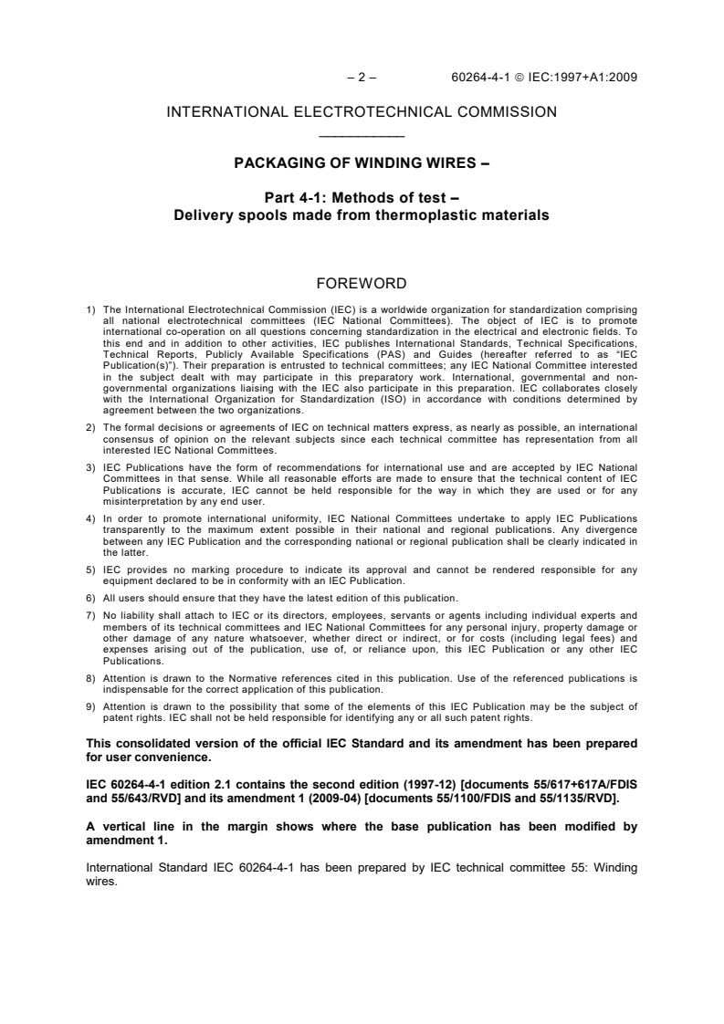 IEC 60264-4-1:1997+AMD1:2009 CSV - Packaging of winding wires - Part 4-1: Methods of test - Delivery spools made from thermoplastic materials Released:25. 06. 2009