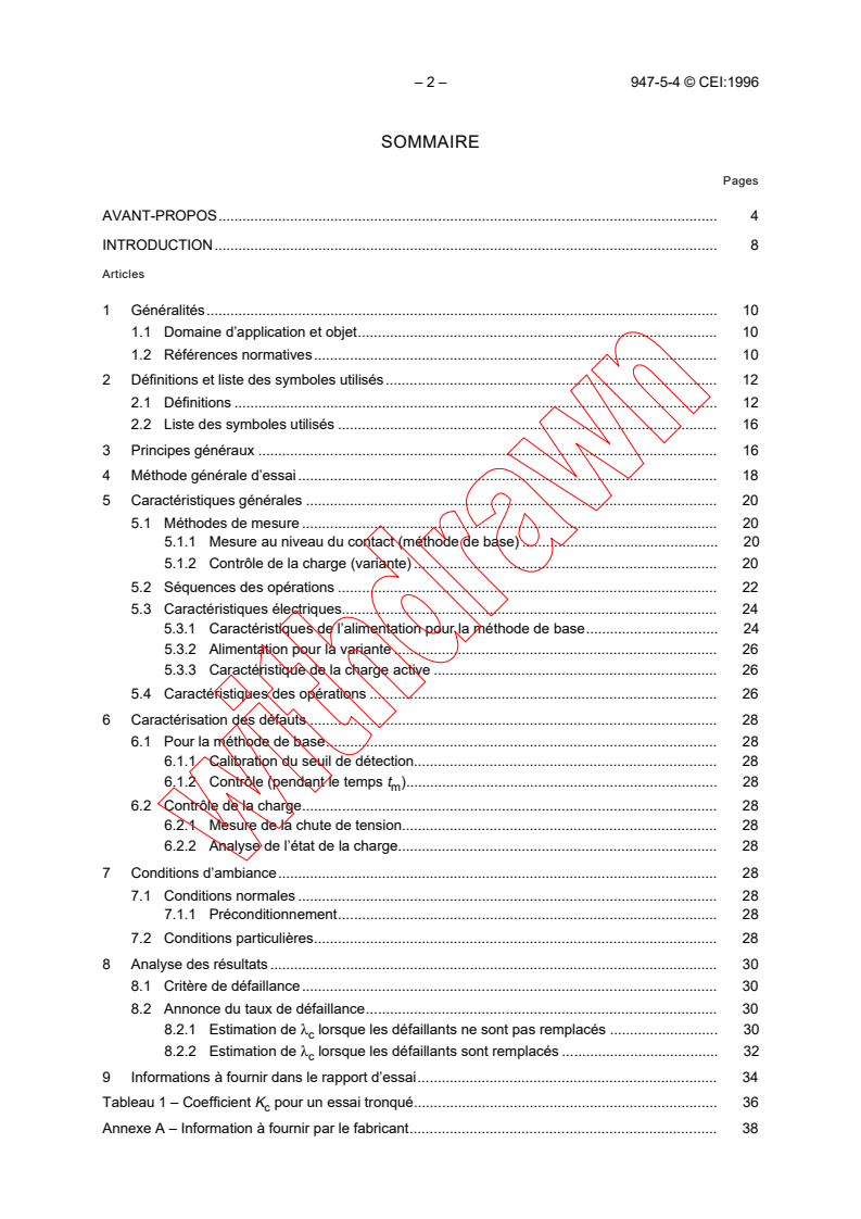 S'applique aux contacts séparables utilisés dans le domaine d'emploi considéré, tels les contacts de commutation pour les circuits de commande. Deux domaines de tensions assignées sont considérées: l'un au-dessus de (et y compris) 10 V (typiquement 24 V) où les contacts sont utilisés pour commuter des charges et pour lesquels une érosion électrique est possible, par exemple les entrées d'automates programmables, et l'autre au-dessous de 10 V (typiquement 5 V) où l'érosion électrique des contacts est négligeable, par exemple dans les circuits électroniques. Il est proposé une méthode pour évaluer les performances de contacts utilisé à basse energie en fournissant: les définitions nécessaires; les principes généraux des méthodes d'essai que sont la mesure et l'enregistrement du comportement du contact à chaque opération; les principes fonctionnels d'un équipement d'essai pour des applications générales; les valeurs d'essai préférentielles; les modalités particulières d'essai pour des contacts destinés à des applications spécifiques (par exemple la commutation d'entrées d'automates programmables); les informations à fournir dans le rapport d'essai; l'interprétation et la présentation des résultats d'essai.