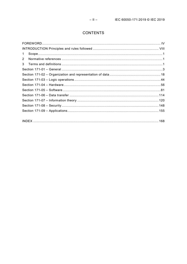 IEC 60050-171:2019 is a standard published by the International Electrotechnical Commission (IEC). Its full title is "International Electrotechnical Vocabulary (IEV) - Part 171: Digital technology - Fundamental concepts". This standard covers: IEC 60050-171:2019 gives the general terminology used in digital technology, as well as general terms pertaining to specific applications and associated technologies. This first edition cancels and replaces Section 101-12 of IEC 60050-101:1998 and Sections 714-21 to 714-24 of IEC 60050-714:1992. It has the status of a horizontal standard in accordance with IEC Guide 108. This terminology is consistent with the terminology developed in the other specialized parts of the IEV.