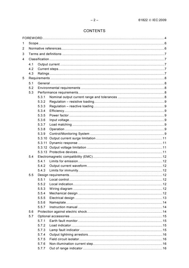 IEC 61822:2009 is a standard published by the International Electrotechnical Commission (IEC). Its full title is "Electrical installations for lighting and beaconing of aerodromes - Constant current regulators". This standard covers: IEC 61822:2009 specifies the requirements for a Constant Current Regulator (CCR) having a nominal output of 6,6 A for use in an aeronautical ground lighting constant current series circuit. However, CCRs may be manufactured which have a different power rating (kVA) and current steps than those specified in this standard in order to be used on existing circuits. This standard should be applied where appropriate for these CCRs. This second edition cancels and replaces the first edition published in 2002. It is a technical revision. This edition includes the following significant technical changes with respect to the previous edition: a) revision and update of terms and definitions; b) addition of new paragraphs, such as "Nominal output current range and tolerances"; c) modification of some paragraphs, such as those related to "Local control" and "Remote control"; d) deletion of some paragraphs, in particular "Power transformers" and "Output current indicator".