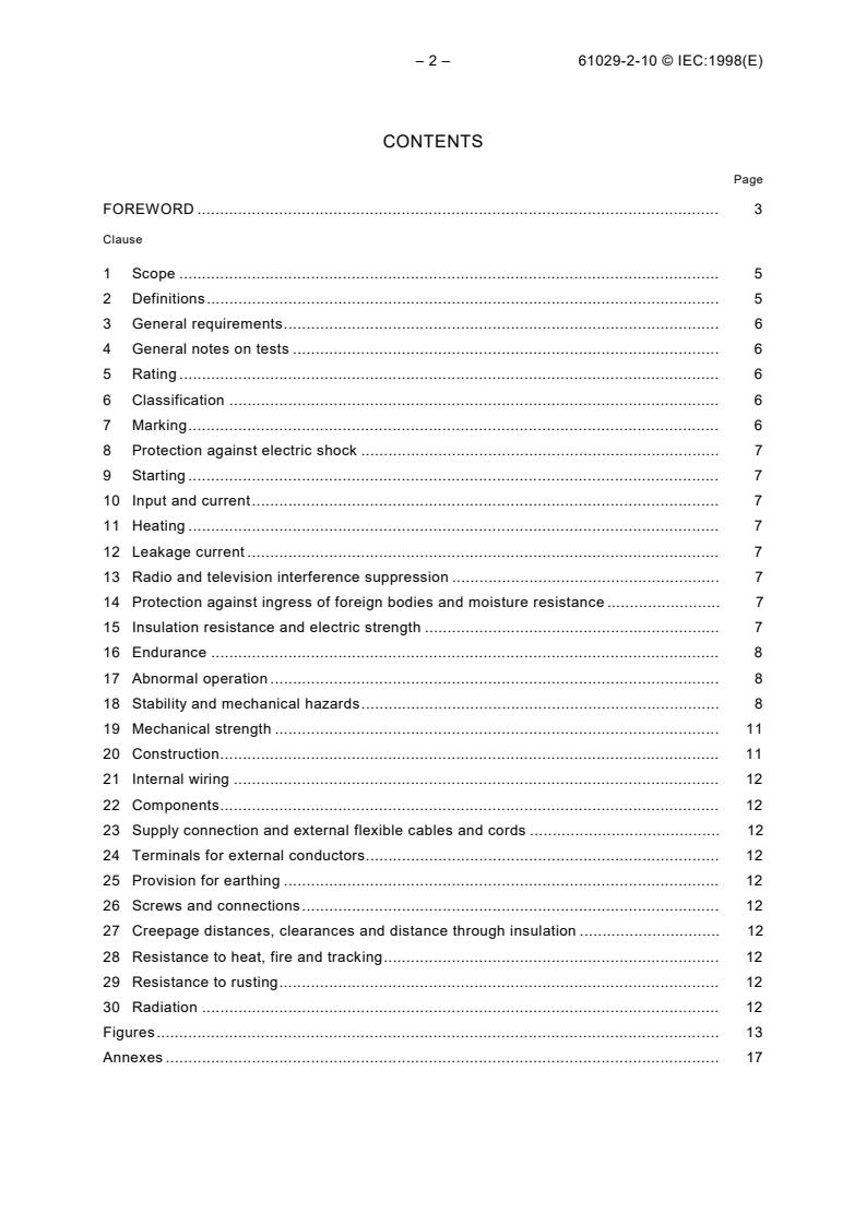 - Additional technical clauses: Requirements align with general clauses in IEC 61029-1 covering electrical protection, insulation, wiring, components, and endurance tests.