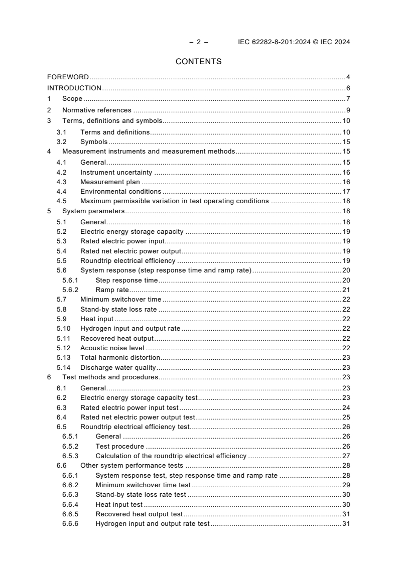 Keywords: IEC 62282-8-201:2024, power-to-power, hydrogen energy storage, electrolyser, fuel cell, roundtrip electrical efficiency, test procedures, energy storage capacity, hydrogen input/output rate.
