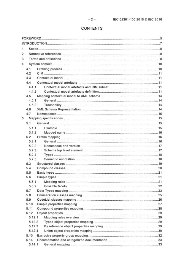 IEC 62361-100:2016 is a standard published by the International Electrotechnical Commission (IEC). Its full title is "Power systems management and associated information exchange - Interoperability in the long term - Part 100: CIM profiles to XML schema mapping". This standard covers: IEC 62361-100:2016 describes a mapping from CIM profiles to W3C XML Schemas, intended to facilitate the exchange of information in the form of XML documents whose semantics are defined by the IEC CIM and whose syntax is defined by a W3C XML schema.