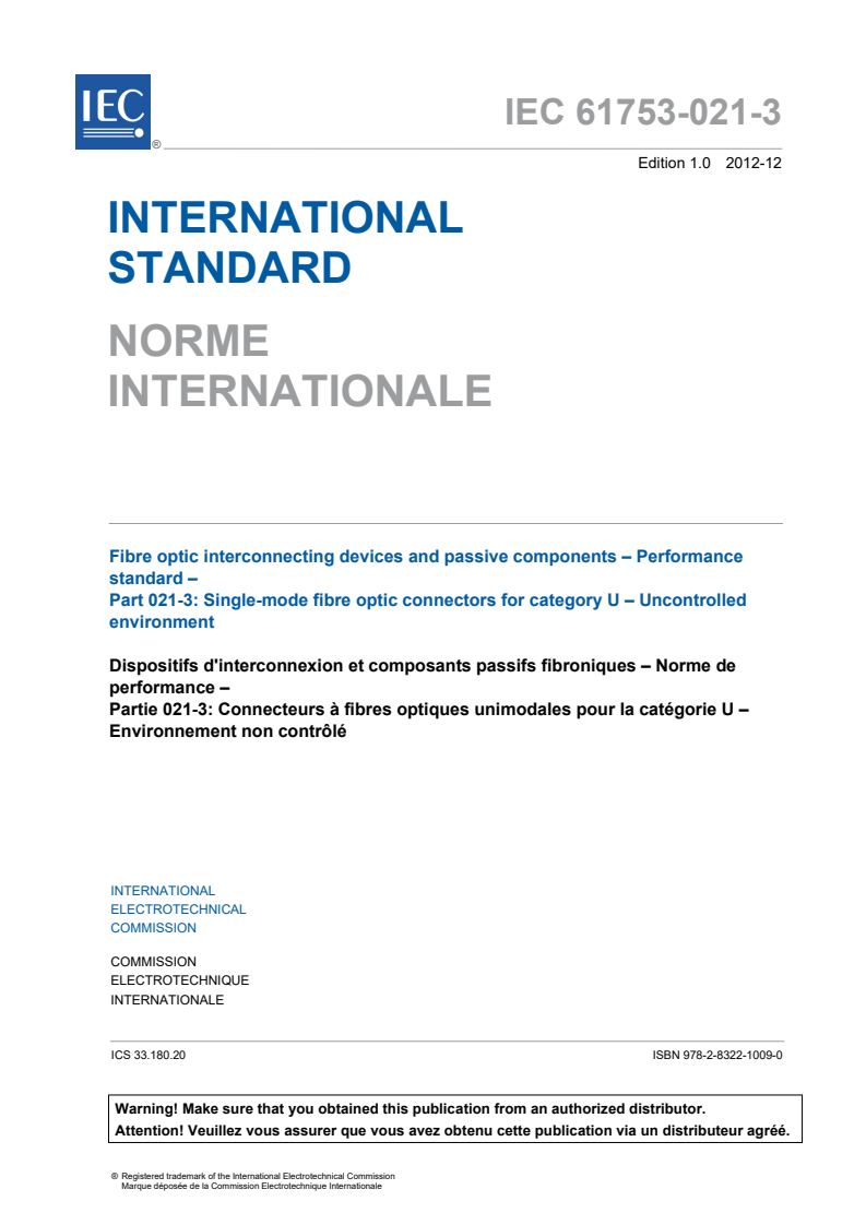 IEC 61753-021-3:2012 - Fibre optic interconnecting devices and passive components - Performance standard - Part 021-3: Single-mode fibre optic connectors for category U - Uncontrolled environment Released:12/5/2012