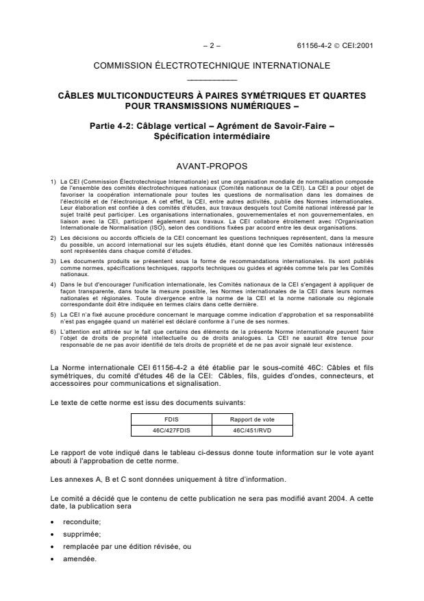 IEC 61156-4-2:2001 is an international standard published by the International Electrotechnical Commission (IEC) that specifies Capability Approval requirements for multicore and symmetrical pair/quad cables used in digital communication, specifically focusing on riser cables. This sectional specification complements the general and intermediate specifications outlined in IEC 61156-1 and IEC 61156-4 by establishing detailed guidelines for quality assurance, manufacturing processes, and maintenance of capability approval in vertical cabling installations.