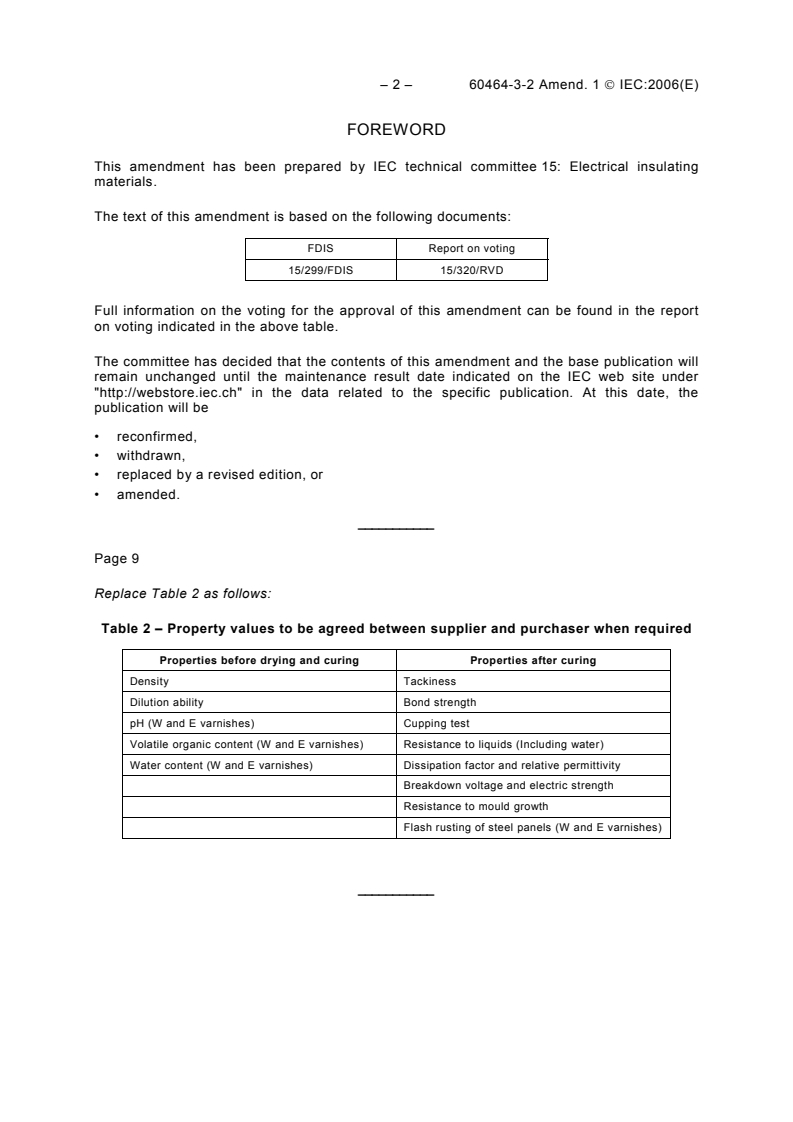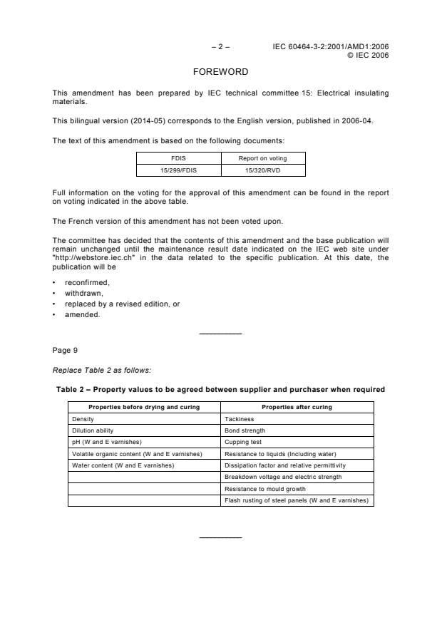 IEC 60464-3-2:2001/AMD1:2006 - Amendment 1 - Varnishes used for electrical insulation - Part 3: Specifications for individual materials - Sheet 2: Hot curing impregnating varnishes Released:4/27/2006 Isbn:2831886112