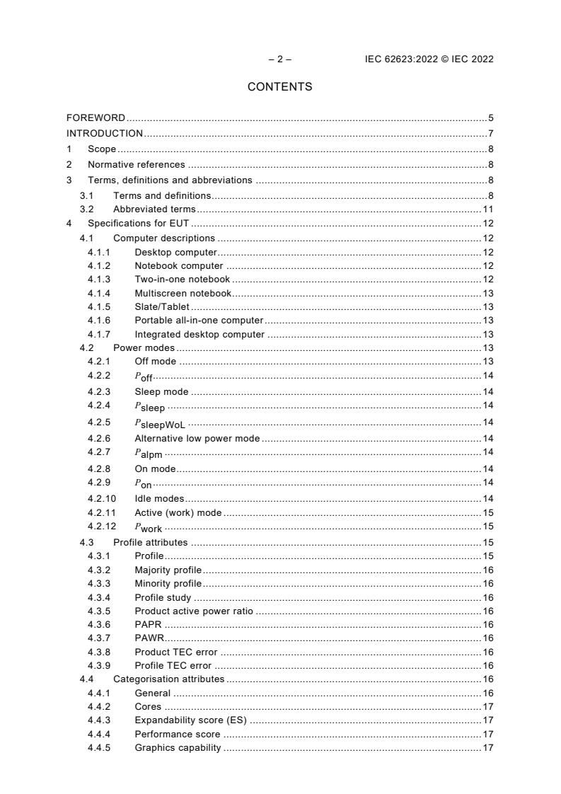 IEC 62623:2022 is a standard published by the International Electrotechnical Commission (IEC). Its full title is "Desktop and notebook computers - Measurement of energy consumption". This standard covers: IEC 62623:2022 covers personal computing products. It applies to desktop and notebook computers as defined in 4.1 that are marketed as final products and that are hereafter referred to as the equipment under test (EUT) or product. This document specifies: - a test procedure to enable the measurement of the power and/or energy consumption in each of the EUT's power modes; - formulas for calculating the typical energy consumption (TEC) for a given period (normally annual); - a majority profile to be used with this document which enables conversion of average power into energy within the TEC formulas; - a pre-defined format for the presentation of results. This document does not set any pass/fail criteria for the EUTs. Users of the test results define such criteria. IEC 62623:2022 cancels and replaces the first edition published in 2012. This edition constitutes a technical revision. The first edition of this standard was originally based on ECMA-383. This edition includes the following significant technical changes with respect to the previous edition: a) Additions to terms & definitions and modification to short & long idle descriptions. b) Test setup modifications for notebooks where battery pack cannot be removed for testing. c) Categorisation procedure based on ECMA-389 removed. d) Replace majority profile with new duty cycle study including new duty cycle attributes for desktop and notebook in a residential and enterprise application. e) Removal of any reference and test methodology to ENERGY STAR V5.