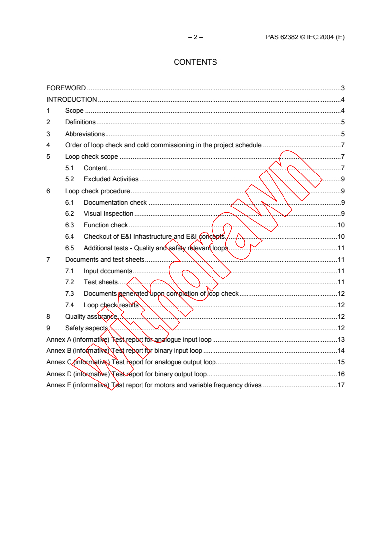 IEC PAS 62382:2004 is a technical specification published by the International Electrotechnical Commission (IEC). Its full title is "Electrical and instrumentation loop check". This standard covers: describes the recommended steps to complete a loop check which comprises the activities between the completion of loop construction (including installation and point-to-point checks) and the start-up of the cold commissioning. This document is applicable for the construction of new plants and for expansion/retrofits (i.e. revamping) of E&I installations in existing plants (including PLC, BAS, DCS, Panel-mounted and field instrumentation). It does not include a detailed checkout of power distribution systems except as they relate to the loops being checked (i. e. a motor starter or a power supply to a 4-wire transmitter).