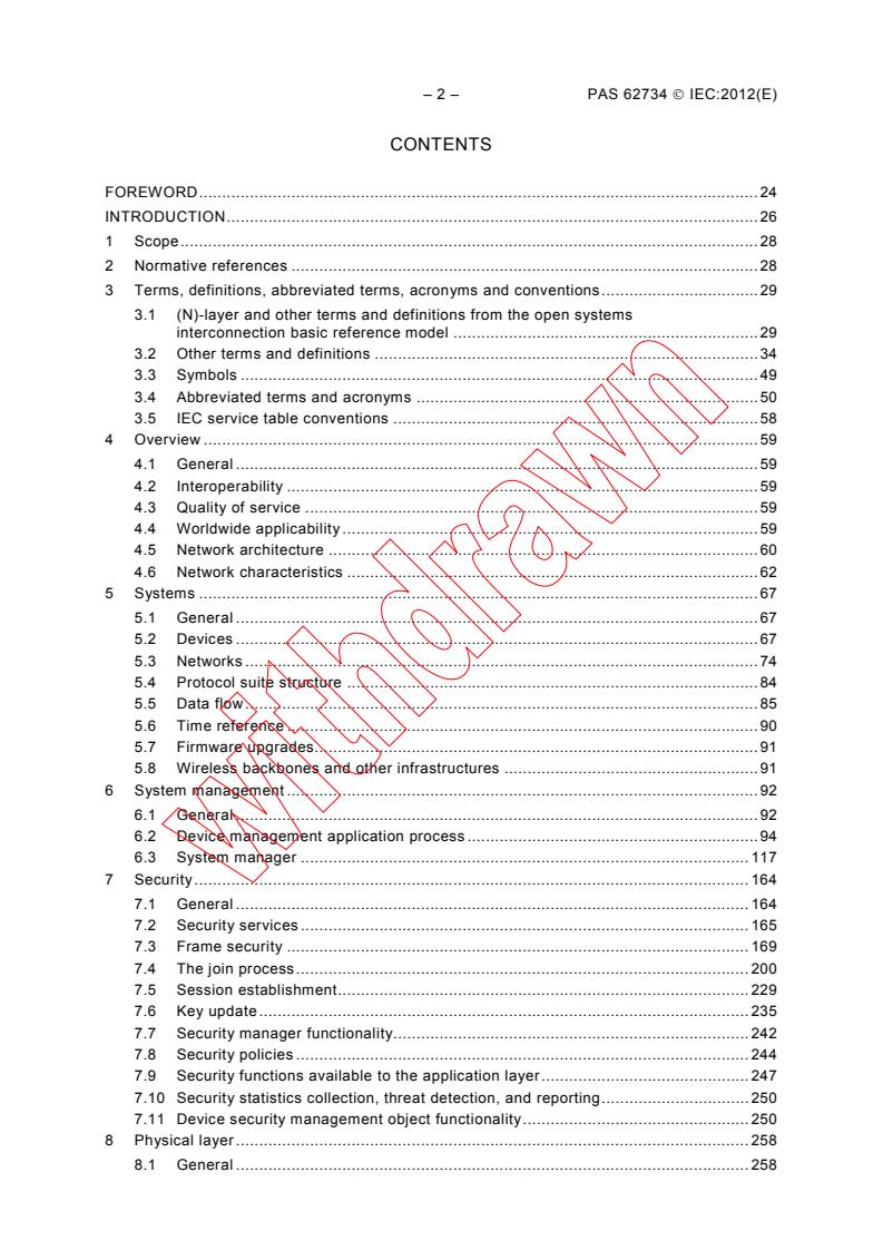 IEC PAS 62734:2012 is a technical specification published by the International Electrotechnical Commission (IEC). Its full title is "Industrial communication networks - Fieldbus specifications - Wireless systems for industrial automation: process control and related applications". This standard covers: IEC/PAS 62734:2012(E) defines the OSI layer specifications (e.g., PhL, DL, etc.), security specifications, and management (including network and device configuration) specifications for wireless devices serving application classes 1 through 5 and optionally class 0 for fixed, portable, and moving devices. It addresses the performance needs for periodic monitoring and process control where latencies on the order of 100 ms can be tolerated, with optional behavior for shorter latency.