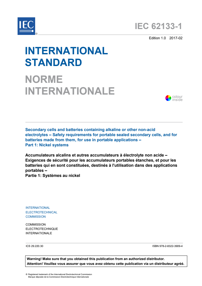 IEC 62133-1:2017 is a standard published by the International Electrotechnical Commission (IEC). Its full title is "Secondary cells and batteries containing alkaline or other non-acid electrolytes - Safety requirements for portable sealed secondary cells, and for batteries made from them, for use in portable applications - Part 1: Nickel systems". This standard covers: IEC 62133-1:2017 specifies requirements and tests for the safe operation of portable sealed secondary nickel cells and batteries containing alkaline electrolyte, under intended use and reasonably foreseeable misuse. This first edition cancels and replaces the second edition of IEC 62133 published in 2012. It constitutes a technical revision. This edition includes the following significant technical changes with respect to IEC 62133:2012: - separation of lithium systems into a separate Part 2; - inclusion of button cell requirements.