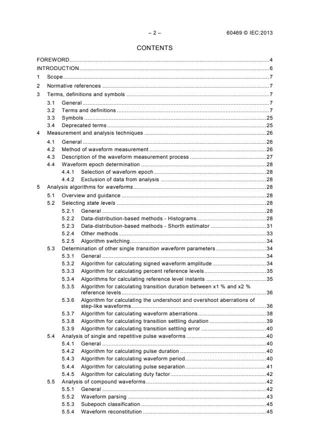 - and electrical, chemical, and thermal pulses encountered and used in a variety of industrial, commercial, and consumer applications. This standard does not apply to sinusoidally-varying or other continuously-varying signals and their waveforms. The object of this standard is to facilitate accurate and precise communication concerning parameters of transitions, pulses, and related waveforms and the techniques and procedures for measuring them. IEC 60469:2013 combine the contents of IEC 60469-1 and IEC 60469-2. IEC 60469-1 dealt with terms and definitions for describing waveform parameters and IEC 60469-2 described the waveform measurement process. Other technical revisions include updating of terminology, errors correction, algorithms addition for computing values of pulse parameters, and addition of a newly-developed method for computing state levels. Changes to the definitions include adding new terms and definitions, deleting unused terms and definitions, expanding the list of deprecated terms, and updating and modifying existing definitions.