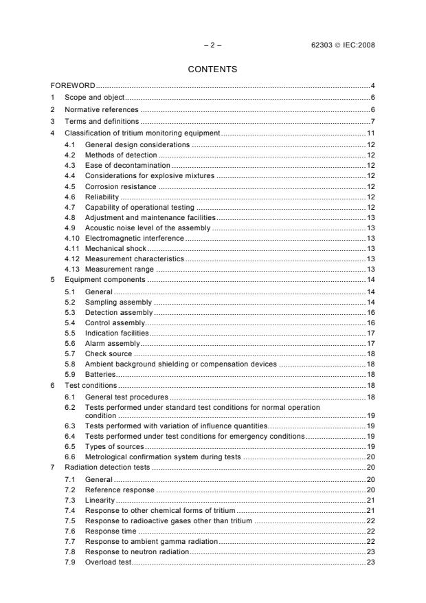 IEC 62303:2008 is applicable to equipment used for sampling and continuous measurement of tritium in the workplace, in gaseous effluents discharged into the environment as well as in the environment itself and it is applicable to installed, portable and transportable equipment. The object is to establish mandatory general requirements and to present examples of acceptable methods and equipment for continuously monitoring and/or sampling airborne tritium. Complements IEC 60761-5.