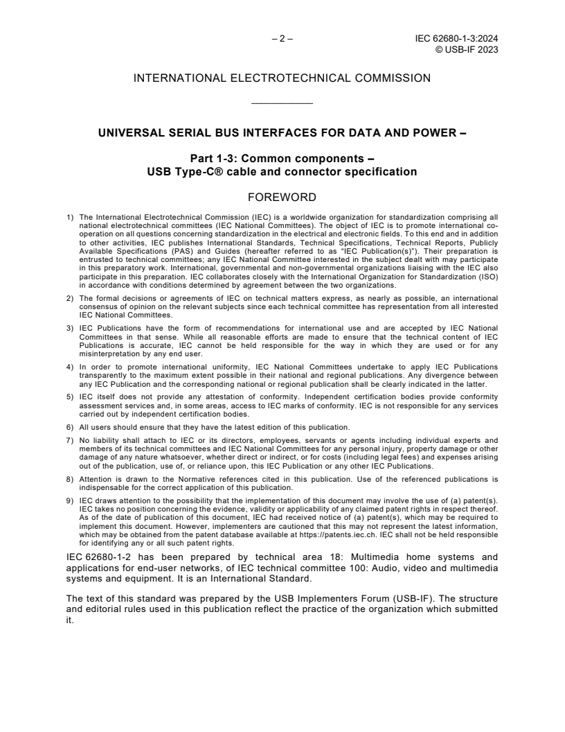 IEC 62680-1-3:2024 cancels and replaces the fifth edition published in 2022 and constitutes a technical revision. This standard is the USB-IF publication Universal Serial Bus Type-C Cable and Connector Specification Revision 2.3.