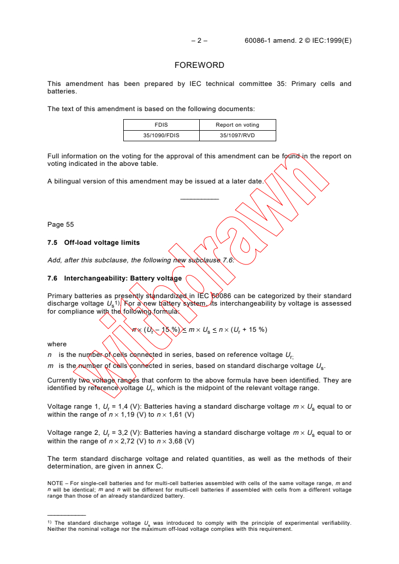 The amendment establishes a formula to assess interchangeability of primary battery voltages based on their standard discharge voltage. Two primary voltage ranges are defined:- Voltage Range 1: Reference voltage 1.4 V, covering nominal 1.5 V batteries (systems A, F, G, L, P, S).