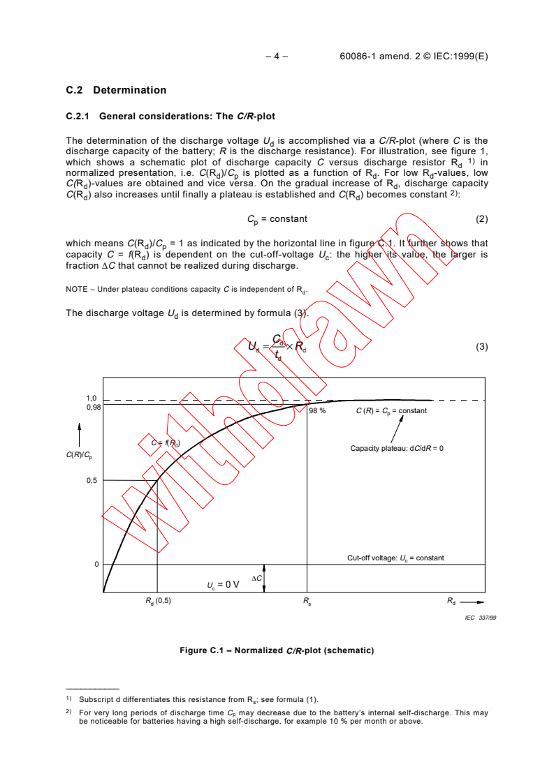 Annex C describes the mathematical definitions and experimental protocols for determining the standard discharge voltage using the C/R-plot technique. This includes:- Discharge capacity versus resistance analysis