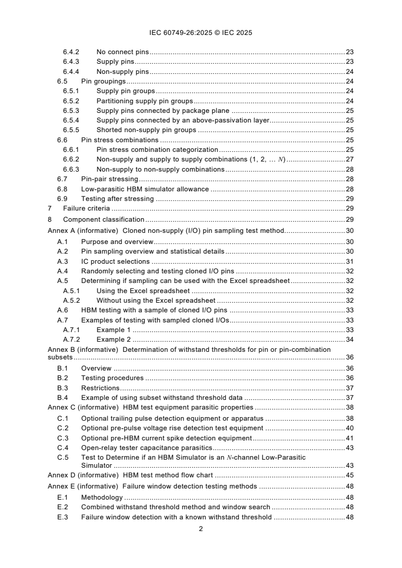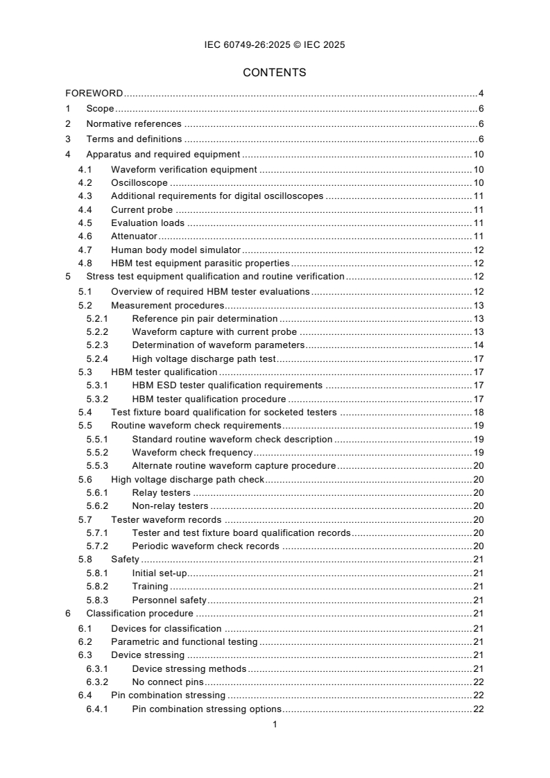 IEC 60749-26:2025 establishes the procedure for testing, evaluating, and classifying components and microcircuits in accordance with their susceptibility (sensitivity) to damage or degradation by exposure to a defined human body model (HBM) electrostatic discharge (ESD). The purpose of this document is to establish a test method that will replicate HBM failures and provide reliable, repeatable HBM ESD test results from tester to tester, regardless of component type. Repeatable data will allow accurate classifications and comparisons of HBM ESD sensitivity levels. ESD testing of semiconductor devices is selected from this test method, the machine model (MM) test method (see IEC 60749‑27) or other ESD test methods in the IEC 60749 series. Unless otherwise specified, this test method is the one selected.
